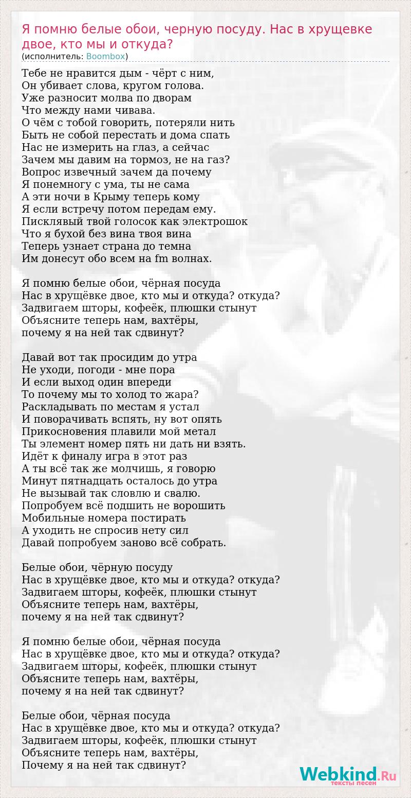 Тебе не нравится дым - чёрт с ним, Он убивает слова, кругом голова. Уже разносит молва по дворам Что между нами чивава. О чём с тобой говорить, потеряли нить Быть не собой перестать и дома спать Нас не измерить на глаз, а сейчас Зачем мы давим на тормоз, не на газ? Вопрос извечный зачем да почему Я понемногу с ума, ты не сама А эти ночи в Крыму теперь кому Я если встречу потом передам ему. Писклявый твой голосок как электрошок Что я бухой без вина твоя вина Теперь узнает страна до темна Им донесут обо всем на fm волнах. Я помню белые обои, чёрная посуда Нас в хрущёвке двое, кто мы и откуда? откуда? Задвигаем шторы, кофеёк, плюшки стынут Объясните теперь нам, вахтёры, почему я на ней так сдвинут? Давай вот так просидим до утра Не уходи, погоди - мне пора И если выход один впереди То почему мы то холод то жара? Раскладывать по местам я устал И поворачивать вспять, ну вот опять Прикосновения плавили мой метал Ты элемент номер пять ни дать ни взять. Идёт к финалу игра в этот раз А ты всё так же молчишь, я говорю Минут пятнадцать осталось до утра Не вызывай так словлю и свалю. Попробуем всё подшить не ворошить Мобильные номера постирать А уходить не спросив нету сил Давай попробуем заново всё собрать. Белые обои, чёрную посуду Нас в хрущёвке двое, кто мы и откуда? откуда? Задвигаем шторы, кофеёк, плюшки стынут Объясните теперь нам, вахтёры, почему я на ней так сдвинут? Я помню белые обои, чёрная посуда Нас в хрущёвке двое, кто мы и откуда? откуда? Задвигаем шторы, кофеёк, плюшки стынут Объясните теперь нам, вахтёры, почему я на ней так сдвинут? Белые обои, чёрная посуда Нас в хрущёвке двое, кто мы и откуда? откуда? Задвигаем шторы, кофеёк, плюшки стынут Объясните теперь нам, вахтёры, Почему я на ней так сдвинут?