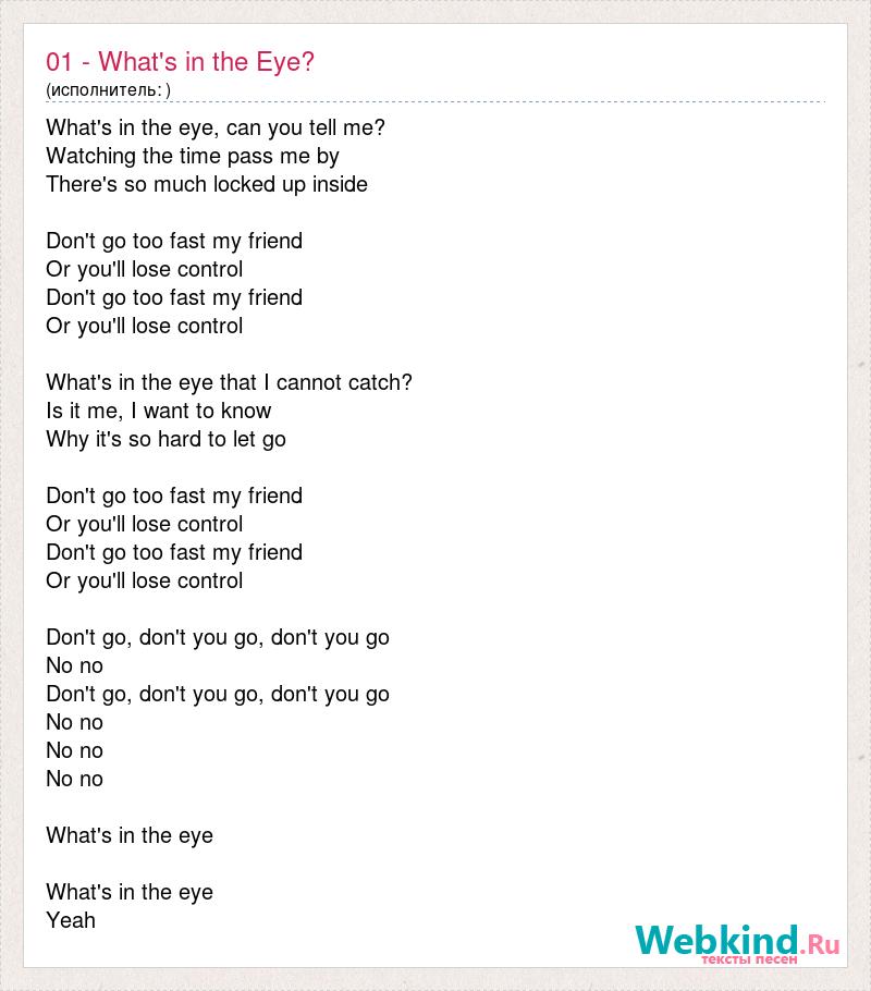 What's in the eye, can you tell me? Watching the time pass me by There's so much locked up inside Don't go too fast my friend Or you'll lose control Don't go too fast my friend Or you'll lose control What's in the eye that I cannot catch? Is it me, I want to know Why it's so hard to let go Don't go too fast my friend Or you'll lose control Don't go too fast my friend Or you'll lose control Don't go, don't you go, don't you go No no Don't go, don't you go, don't you go No no No no No no What's in the eye What's in the eye Yeah