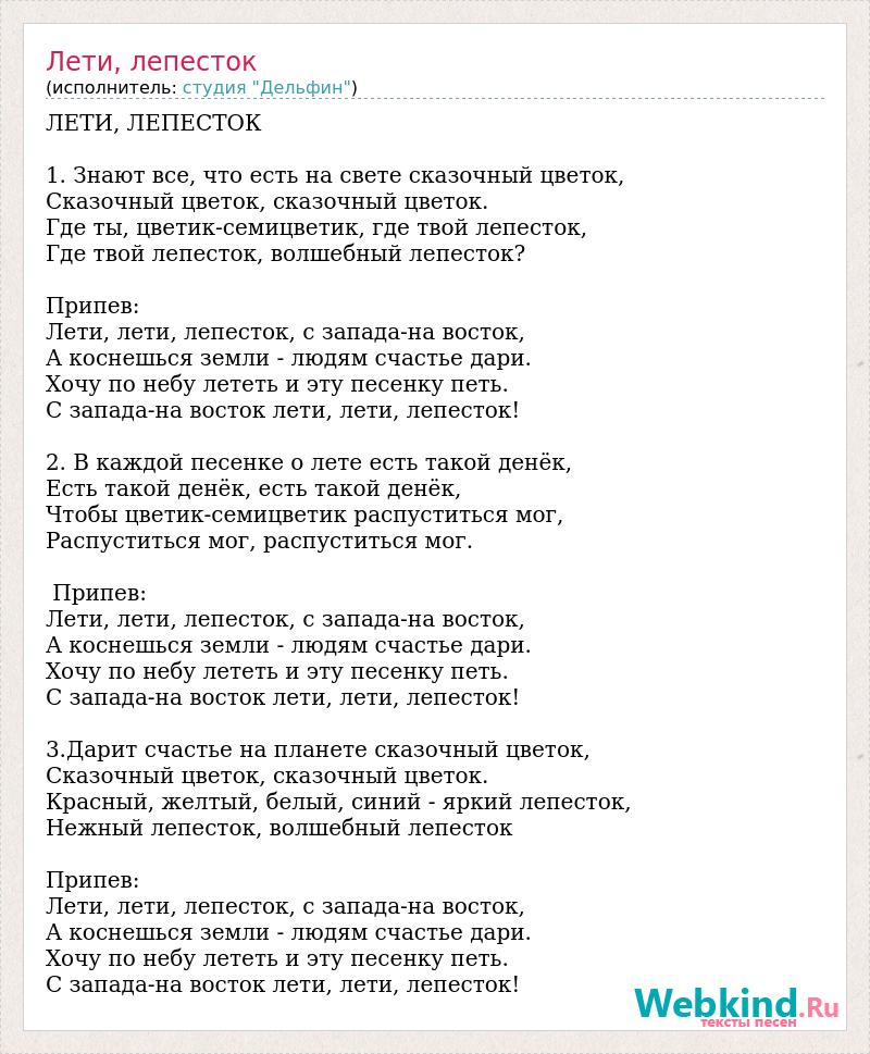 ЛЕТИ, ЛЕПЕСТОК 1. Знают все, что есть на свете сказочный цветок, Сказочный цветок, сказочный цветок. Где ты, цветик-семицветик, где твой лепесток, Где твой лепесток, волшебный лепесток? Припев: Лети, лети, лепесток, с запада-на восток, А коснешься земли - людям счастье дари. Хочу по небу лететь и эту песенку петь. С запада-на восток лети, лети, лепесток! 2. В каждой песенке о лете есть такой денёк, Есть такой денёк, есть такой денёк, Чтобы цветик-семицветик распуститься мог, Распуститься мог, распуститься мог. Припев: Лети, лети, лепесток, с запада-на восток, А коснешься земли - людям счастье дари. Хочу по небу лететь и эту песенку петь. С запада-на восток лети, лети, лепесток! 3.Дарит счастье на планете сказочный цветок, Сказочный цветок, сказочный цветок. Красный, желтый, белый, синий - яркий лепесток, Нежный лепесток, волшебный лепесток Припев: Лети, лети, лепесток, с запада-на восток, А коснешься земли - людям счастье дари. Хочу по небу лететь и эту песенку петь. С запада-на восток лети, лети, лепесток!