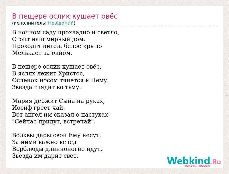 В ночном саду прохладно и светло, Стоит наш мирный дом. Проходит ангел, белое крыло Мелькает за окном. В пещере ослик кушает овёс, В яслях лежит Христос, Осленок носом тянется к Нему, Звезда глядит во тьму. Мария держит Сына на руках, Иосиф греет чай. Вот ангел им сказал о пастухах: "Сейчас придут, встречай". Волхвы дары свои Ему несут, За ними важно вслед Верблюды длинноногие идут, Звезда им дарит свет.