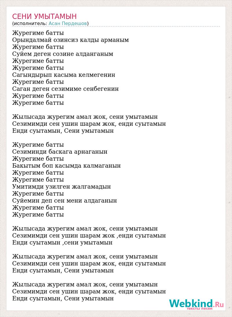 Журегиме батты Орындалмай озинсиз калды арманым Журегиме батты Суйем деген созине алданганым Журегиме батты Журегиме батты Сагындырып касыма келмегенин Журегиме батты Саган деген сезимиме сенбегенин Журегиме батты Журегиме батты Жылысада журегим амал жок, сени умытамын Сезимимди сен ушин шарам жок, енди суытамын Енди суытамын, Сени умытамын Журегиме батты Сезиминди баскага арнаганын Журегиме батты Бакытым боп касымда калмаганын Журегиме батты Журегиме батты Умитимди узилген жалгамадын Журегиме батты Суйемин деп сен мени алдаганын Журегиме батты Журегиме батты Жылысада журегим амал жок, сени умытамын Сезимимди сен ушин шарам жок ,енди суытамын Енди суытамын ,сени умытамын Жылысада журегим амал жок, сени умытамын Сезимимди сен ушин шарам жок, енди суытамын Енди суытамын, Сени умытамын Жылысада журегим амал жок, сени умытамын Сезимимди сен ушин шарам жок, енди суытамын Енди суытамын, Сени умытамын