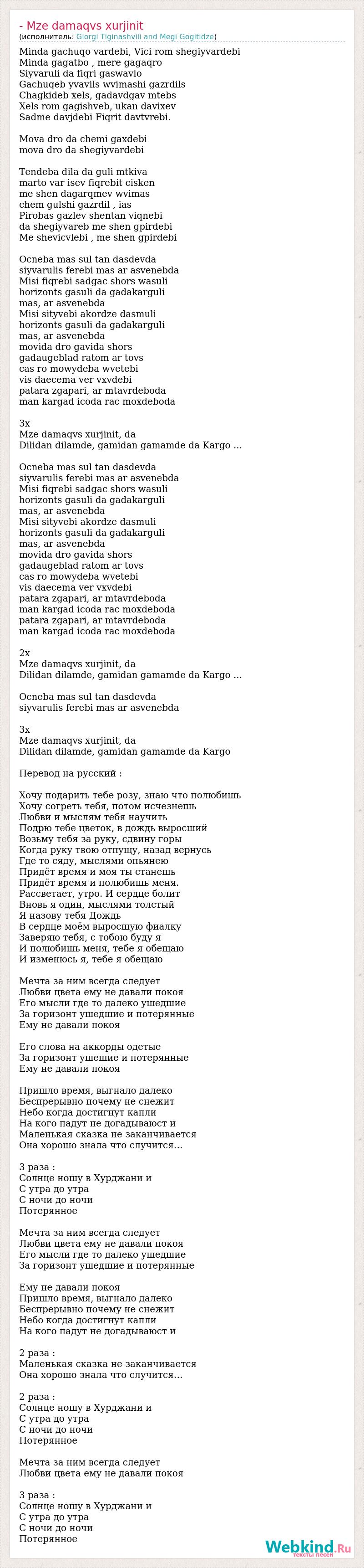 Minda gachuqo vardebi, Vici rom shegiyvardebi Minda gagatbo , mere gagaqro Siyvaruli da fiqri gaswavlo Gachuqeb yvavils wvimashi gazrdils Chagkideb xels, gadavdgav mtebs Xels rom gagishveb, ukan davixev Sadme davjdebi Fiqrit davtvrebi. Mova dro da chemi gaxdebi mova dro da shegiyvardebi Tendeba dila da guli mtkiva marto var isev fiqrebit cisken me shen dagarqmev wvimas chem gulshi gazrdil , ias Pirobas gazlev shentan viqnebi da shegiyvareb me shen gpirdebi Me shevicvlebi , me shen gpirdebi Ocneba mas sul tan dasdevda siyvarulis ferebi mas ar asvenebda Misi fiqrebi sadgac shors wasuli horizonts gasuli da gadakarguli mas, ar asvenebda Misi sityvebi akordze dasmuli horizonts gasuli da gadakarguli mas, ar asvenebda movida dro gavida shors gadaugeblad ratom ar tovs cas ro mowydeba wvetebi vis daecema ver vxvdebi patara zgapari, ar mtavrdeboda man kargad icoda rac moxdeboda 3x Mze damaqvs xurjinit, da Dilidan dilamde, gamidan gamamde da Kargo ... Ocneba mas sul tan dasdevda siyvarulis ferebi mas ar asvenebda Misi fiqrebi sadgac shors wasuli horizonts gasuli da gadakarguli mas, ar asvenebda Misi sityvebi akordze dasmuli horizonts gasuli da gadakarguli mas, ar asvenebda movida dro gavida shors gadaugeblad ratom ar tovs cas ro mowydeba wvetebi vis daecema ver vxvdebi patara zgapari, ar mtavrdeboda man kargad icoda rac moxdeboda patara zgapari, ar mtavrdeboda man kargad icoda rac moxdeboda 2x Mze damaqvs xurjinit, da Dilidan dilamde, gamidan gamamde da Kargo ... Ocneba mas sul tan dasdevda siyvarulis ferebi mas ar asvenebda 3x Mze damaqvs xurjinit, da Dilidan dilamde, gamidan gamamde da Kargo Перевод на русский : Хочу подарить тебе розу, знаю что полюбишь Хочу согреть тебя, потом исчезнешь Любви и мыслям тебя научить Подрю тебе цветок, в дождь выросший Возьму тебя за руку, сдвину горы Когда руку твою отпущу, назад вернусь Где то сяду, мыслями опьянею Придёт время и моя ты станешь Придёт время и полюбишь меня. Рассветает, утро. И сердце болит Вновь я один, мыслями толстый Я назову тебя Дождь В сердце моём выросшую фиалку Заверяю тебя, с тобою буду я И полюбишь меня, тебе я обещаю И изменюсь я, тебе я обещаю Мечта за ним всегда следует Любви цвета ему не давали покоя Его мысли где то далеко ушедшие За горизонт ушедшие и потерянные Ему не давали покоя Его слова на аккорды одетые За горизонт ушешие и потерянные Ему не давали покоя Пришло время, выгнало далеко Беспрерывно почему не снежит Небо когда достигнут капли На кого падут не догадываюст и Маленькая сказка не заканчивается Она хорошо знала что случится… 3 раза : Солнце ношу в Хурджани и С утра до утра С ночи до ночи Потерянное Мечта за ним всегда следует Любви цвета ему не давали покоя Его мысли где то далеко ушедшие За горизонт ушедшие и потерянные Ему не давали покоя Пришло время, выгнало далеко Беспрерывно почему не снежит Небо когда достигнут капли На кого падут не догадываюст и 2 раза : Маленькая сказка не заканчивается Она хорошо знала что случится… 2 раза : Солнце ношу в Хурджани и С утра до утра С ночи до ночи Потерянное Мечта за ним всегда следует Любви цвета ему не давали покоя 3 раза : Солнце ношу в Хурджани и С утра до утра С ночи до ночи Потерянное