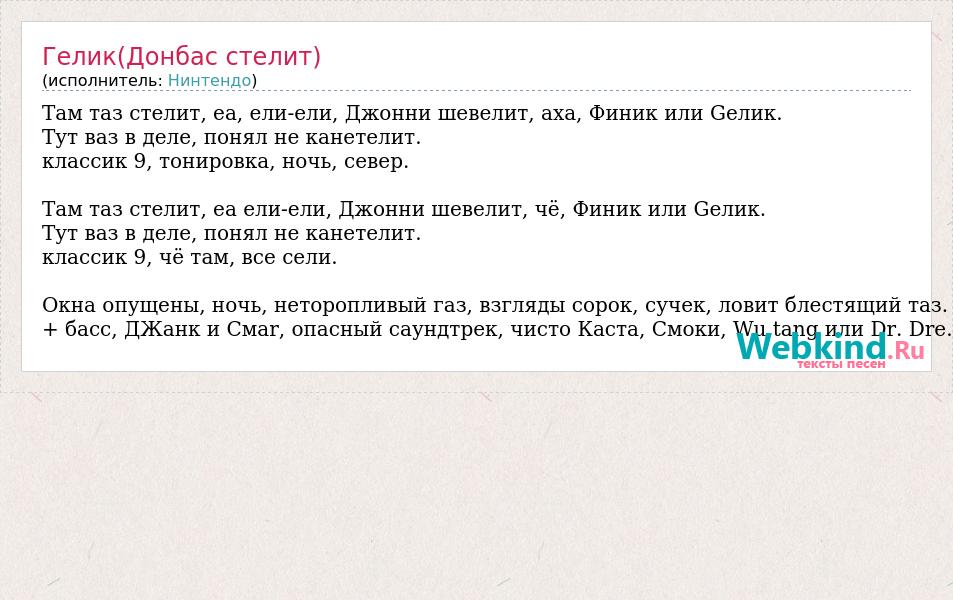 Там таз стелит, еа, ели-ели, Джонни шевелит, аха, Финик или Gелик. Тут ваз в деле, понял не канетелит. классик 9, тонировка, ночь, север. Там таз стелит, еа ели-ели, Джонни шевелит, чё, Финик или Gелик. Тут ваз в деле, понял не канетелит. классик 9, чё там, все сели. Окна опущены, ночь, неторопливый газ, взгляды сорок, сучек, ловит блестящий таз. + басс, ДЖанк и Смаr, опасный саундтрек, чисто Каста, Смоки, Wu tang или Dr. Dre.