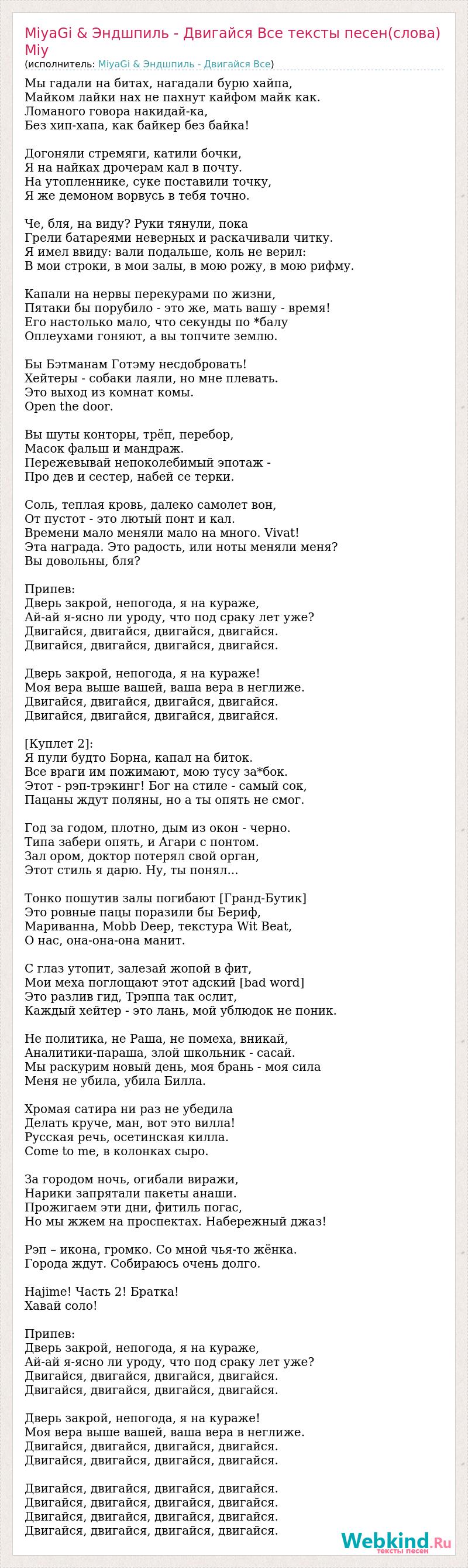 Мы гадали на битах, нагадали бурю хайпа, Майком лайки нах не пахнут кайфом майк как. Ломаного говора накидай-ка, Без хип-хапа, как байкер без байка! Догоняли стремяги, катили бочки, Я на найках дрочерам кал в почту. На утопленнике, суке поставили точку, Я же демоном ворвусь в тебя точно. Че, бля, на виду? Руки тянули, пока Грели батареями неверных и раскачивали читку. Я имел ввиду: вали подальше, коль не верил: В мои строки, в мои залы, в мою рожу, в мою рифму. Капали на нервы перекурами по жизни, Пятаки бы порубило - это же, мать вашу - время! Его настолько мало, что секунды по *балу Оплеухами гоняют, а вы топчите землю. Бы Бэтманам Готэму несдобровать! Хейтеры - собаки лаяли, но мне плевать. Это выход из комнат комы. Open the door. Вы шуты конторы, трёп, перебор, Масок фальш и мандраж. Пережевывай непоколебимый эпотаж - Про дев и сестер, набей се терки. Соль, теплая кровь, далеко самолет вон, От пустот - это лютый понт и кал. Времени мало меняли мало на много. Vivat! Эта награда. Это радость, или ноты меняли меня? Вы довольны, бля? Припев: Дверь закрой, непогода, я на кураже, Ай-ай я-ясно ли уроду, что под сраку лет уже? Двигайся, двигайся, двигайся, двигайся. Двигайся, двигайся, двигайся, двигайся. Дверь закрой, непогода, я на кураже! Моя вера выше вашей, ваша вера в неглиже. Двигайся, двигайся, двигайся, двигайся. Двигайся, двигайся, двигайся, двигайся. [Куплет 2]: Я пули будто Борна, капал на биток. Все враги им пожимают, мою тусу за*бок. Этот - рэп-трэкинг! Бог на стиле - самый сок, Пацаны ждут поляны, но а ты опять не смог. Год за годом, плотно, дым из окон - черно. Типа забери опять, и Агари с понтом. Зал ором, доктор потерял свой орган, Этот стиль я дарю. Ну, ты понял... Тонко пошутив залы погибают [Гранд-Бутик] Это ровные пацы поразили бы Бериф, Мариванна, Mobb Deep, текстура Wit Beat, О нас, она-она-она манит. С глаз утопит, залезай жопой в фит, Мои меха поглощают этот адский [bad word] Это разлив гид, Трэппа так ослит, Каждый хейтер - это лань, мой ублюдок не поник. Не политика, не Раша, не помеха, вникай, Аналитики-параша, злой школьник - сасай. Мы раскурим новый день, моя брань - моя сила Меня не убила, убила Билла. Хромая сатира ни раз не убедила Делать круче, ман, вот это вилла! Русская речь, осетинская килла. Come to me, в колонках сыро. За городом ночь, огибали виражи, Нарики запрятали пакеты анаши. Прожигаем эти дни, фитиль погас, Но мы жжем на проспектах. Набережный джаз! Рэп – икона, громко. Со мной чья-то жёнка. Города ждут. Собираюсь очень долго. Hajime! Часть 2! Братка! Хавай соло! Припев: Дверь закрой, непогода, я на кураже, Ай-ай я-ясно ли уроду, что под сраку лет уже? Двигайся, двигайся, двигайся, двигайся. Двигайся, двигайся, двигайся, двигайся. Дверь закрой, непогода, я на кураже! Моя вера выше вашей, ваша вера в неглиже. Двигайся, двигайся, двигайся, двигайся. Двигайся, двигайся, двигайся, двигайся. Двигайся, двигайся, двигайся, двигайся. Двигайся, двигайся, двигайся, двигайся. Двигайся, двигайся, двигайся, двигайся. Двигайся, двигайся, двигайся, двигайся.
