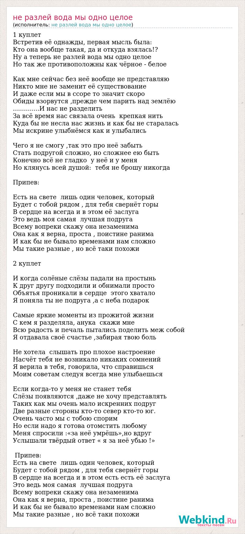 1 куплет Встретив её однажды, первая мысль была: Кто она вообще такая, да и откуда взялась!? Ну а теперь не разлей вода мы одно целое Но так же противоположны как чёрное - белое Как мне сейчас без неё вообще не представляю Никто мне не заменит её существование И даже если мы в ссоре то значит скоро Обиды взорвутся ,прежде чем парить над землёю ………….И нас не разделить За всё время нас связала очень крепкая нить Куда бы не несла нас жизнь и как бы не старалась Мы искрине улыбнёмся как и улыбались Чего я не смогу ,так это про неё забыть Стать подругой сложно, но сложнее ею быть Конечно всё не гладко у неё и у меня Но клянусь всей душой: тебя не брошу никогда Припев: Есть на свете лишь один человек, который Будет с тобой рядом , для тебя свернёт горы В сердце на всегда и в этом её заслуга Это ведь моя самая лучшая подруга Всему вопреки скажу она незаменима Она как я верна, проста , поистине ранима И как бы не бывало временами нам сложно Мы такие разные , но всё таки похожи 2 куплет И когда солёные слёзы падали на простынь К друг другу подходили и обнимали просто Объятья проникали в сердце этого хватало Я поняла ты не подруга ,а с неба подарок Самые яркие моменты из прожитой жизни С кем я разделяла, анука скажи мне Всю радость и печаль пытались поделить меж собой Я отдавала своё счастье ,забирая твою боль Не хотела слышать про плохое настроение Насчёт тебя не возникало никаких сомнений Я верила в тебя, говорила, что справишься Моим советам следуя всегда мне улыбаешься Если когда-то у меня не станет тебя Слёзы появляются ,даже не хочу представлять Таких как мы очень мало искренних подруг Две разные стороны кто-то север кто-то юг. Очень часто мы с тобою спорим Но если надо я готова отомстить любому Меня спросили :«за неё умрёшь»,но вдруг Услышали твёрдый ответ « я за неё убью !» Припев: Есть на свете лишь один человек, который Будет с тобой рядом , для тебя свернёт горы В сердце на всегда и в этом есть есть её заслуга Это ведь моя самая лучшая подруга Всему вопреки скажу она незаменима Она как я верна, проста , поистине ранима И как бы не бывало временами нам сложно Мы такие разные , но всё таки похожи