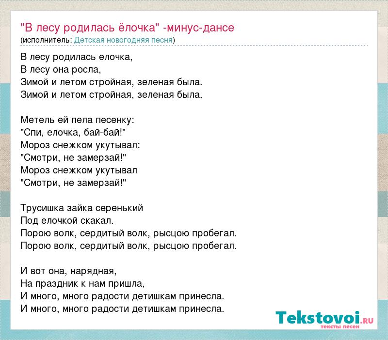 В лесу родилась елочка, В лесу она росла, Зимой и летом стройная, зеленая была. Зимой и летом стройная, зеленая была. Метель ей пела песенку: "Спи, елочка, бай-бай!" Мороз снежком укутывал: "Смотри, не замерзай!" Мороз снежком укутывал "Смотри, не замерзай!" Трусишка зайка серенький Под елочкой скакал. Порою волк, сердитый волк, рысцою пробегал. Порою волк, сердитый волк, рысцою пробегал. И вот она, нарядная, На праздник к нам пришла, И много, много радости детишкам принесла. И много, много радости детишкам принесла.
