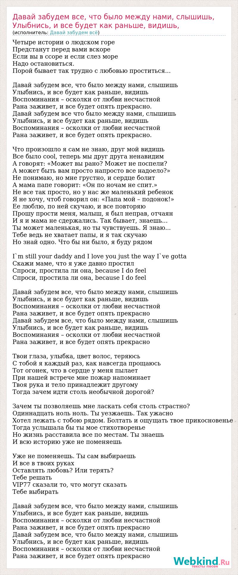 Четыре истории о людском горе Предстанут перед вами вскоре Если вы в ссоре и если слез море Надо остановиться. Порой бывает так трудно с любовью проститься... Давай забудем все, что было между нами, слышишь Улыбнись, и все будет как раньше, видишь Воспоминания – осколки от любви несчастной Рана заживет, и все будет опять прекрасно. Давай забудем все что было между нами, слышишь Улыбнись, и все будет как раньше, видишь Воспоминания – осколки от любви несчастной Рана заживет, и все будет опять прекрасно. Что произошло я сам не знаю, друг мой видишь Все было cool, теперь мы друг друга ненавидим А говорят: «Может вы рано? Может не поспели? А может быть вам просто напросто все надоело?» Не понимаю, но мне грустно, и сердце болит А мама папе говорит: «Он по ночам не спит.» Не все так просто, но у нас же маленький ребенок Я не хочу, чтоб говорил он: «Папа мой – подонок!» Ее люблю, по ней скучаю, и все повторяю Прошу прости меня, малыш, я был неправ, отчаян И я и мама не сдержались. Так бывает, знаешь... Ты может маленькая, но ты чувствуешь. Я знаю... Тебе ведь не хватает папы, и я так скучаю Но знай одно. Что бы ни было, я буду рядом I`m still your daddy and I love you just the way I`ve gotta Скажи маме, что я уже давно простил Спроси, простила ли она, because I do feel Спроси, простила ли она, because I do feel Давай забудем все, что было между нами, слышишь Улыбнись, и все будет как раньше, видишь Воспоминания – осколки от любви несчастной Рана заживет, и все будет опять прекрасно Давай забудем все, что было между нами, слышишь Улыбнись, и все будет как раньше, видишь Воспоминания – осколки от любви несчастной Рана заживет, и все будет опять прекрасно Твои глаза, улыбка, цвет волос, теряюсь С тобой я каждый раз, как навсегда прощаюсь Тот огонек, что в сердце у меня пылает При нашей встрече мне пожар напоминает Твоя рука и тело принадлежит другому Тогда зачем идти столь необычной дорогой? Зачем ты позволяешь мне ласкать себя столь страстно? Одиннадцать ноль ноль. Ты уезжаешь. Так ужасно Хотел лежать с тобою рядом. Болтать и ощущать твое прикосновенье Тогда услышала бы ты мое стихотворенье Но жизнь расставила все по местам. Ты знаешь И всю историю уже не поменяешь Уже не поменяешь. Ты сам выбираешь И все в твоих руках Оставлять любовь? Или терять? Тебе решать VIP77 сказали то, что могут сказать Тебе выбирать Давай забудем все, что было между нами, слышишь Улыбнись, и все будет как раньше, видишь Воспоминания – осколки от любви несчастной Рана заживет, и все будет опять прекрасно Давай забудем все, что было между нами, слышишь Улыбнись, и все будет как раньше, видишь Воспоминания – осколки от любви несчастной Рана заживет, и все будет опять прекрасно