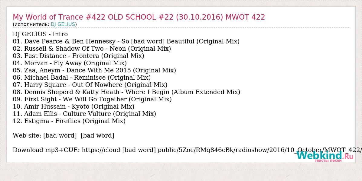 DJ GELIUS - Intro 01. Dave Pearce & Ben Hennessy - So [bad word] Beautiful (Original Mix) 02. Russell & Shadow Of Two - Neon (Original Mix) 03. Fast Distance - Frontera (Original Mix) 04. Morvan - Fly Away (Original Mix) 05. Zaa, Aneym - Dance With Me 2015 (Original Mix) 06. Michael Badal - Reminisce (Original Mix) 07. Harry Square - Out Of Nowhere (Original Mix) 08. Dennis Sheperd & Katty Heath - Where I Begin (Album Extended Mix) 09. First Sight - We Will Go Together (Original Mix) 10. Amir Hussain - Kyoto (Original Mix) 11. Adam Ellis - Culture Vulture (Original Mix) 12. Estigma - Fireflies (Original Mix) Web site: [bad word] [bad word] Download mp3+CUE: https://cloud [bad word] public/5Zoc/RMq846cBk/radioshow/2016/10_October/MWOT_422/