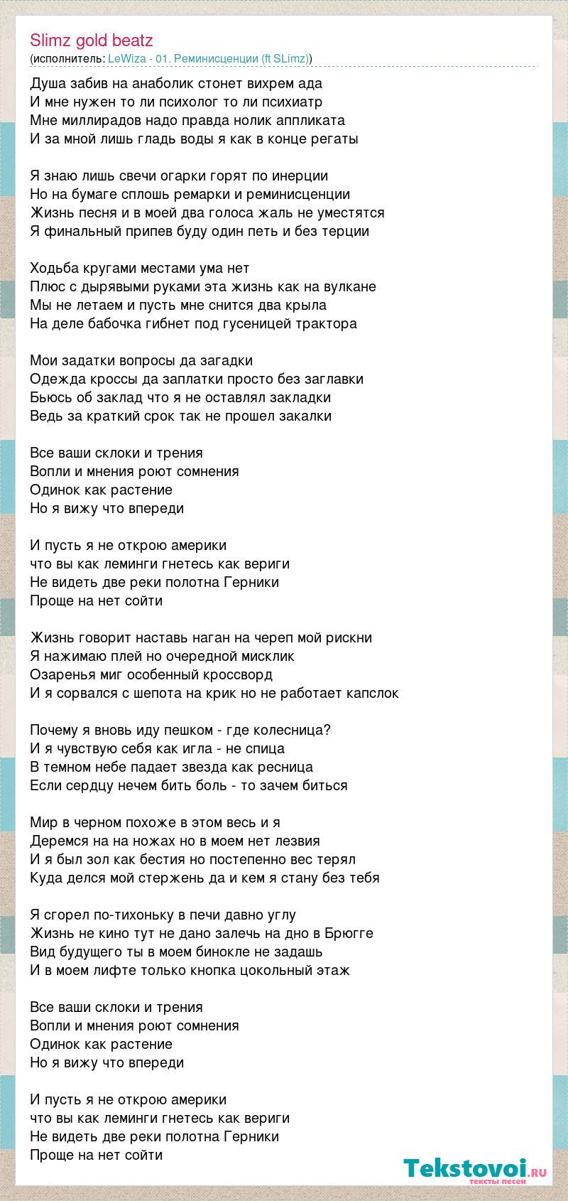 Душа забив на анаболик стонет вихрем ада И мне нужен то ли психолог то ли психиатр Мне миллирадов надо правда нолик аппликата И за мной лишь гладь воды я как в конце регаты Я знаю лишь свечи огарки горят по инерции Но на бумаге сплошь ремарки и реминисценции Жизнь песня и в моей два голоса жаль не уместятся Я финальный припев буду один петь и без терции Ходьба кругами местами ума нет Плюс с дырявыми руками эта жизнь как на вулкане Мы не летаем и пусть мне снится два крыла На деле бабочка гибнет под гусеницей трактора Мои задатки вопросы да загадки Одежда кроссы да заплатки просто без заглавки Бьюсь об заклад что я не оставлял закладки Ведь за краткий срок так не прошел закалки Все ваши склоки и трения Вопли и мнения роют сомнения Oдинок как растение Hо я вижу что впереди И пусть я не открою америки что вы как леминги гнетесь как вериги Не видеть две реки полотна Герники Проще на нет сойти Жизнь говорит наставь наган на череп мой рискни Я нажимаю плей но очередной мисклик Озаренья миг особенный кроссворд И я сорвался с шепота на крик но не работает капслок Почему я вновь иду пешком - где колесница? И я чувствую себя как игла - не спица В темном небе падает звезда как ресница Если сердцу нечем бить боль - то зачем биться Мир в черном похоже в этом весь и я Деремся на на ножах но в моем нет лезвия И я был зол как бестия но постепенно вес терял Куда делся мой стержень да и кем я стану без тебя Я сгорел по-тихоньку в печи давно углу Жизнь не кино тут не дано залечь на дно в Брюгге Вид будущего ты в моем бинокле не задашь И в моем лифте только кнопка цокольный этаж Все ваши склоки и трения Вопли и мнения роют сомнения Oдинок как растение Hо я вижу что впереди И пусть я не открою америки что вы как леминги гнетесь как вериги Не видеть две реки полотна Герники Проще на нет сойти