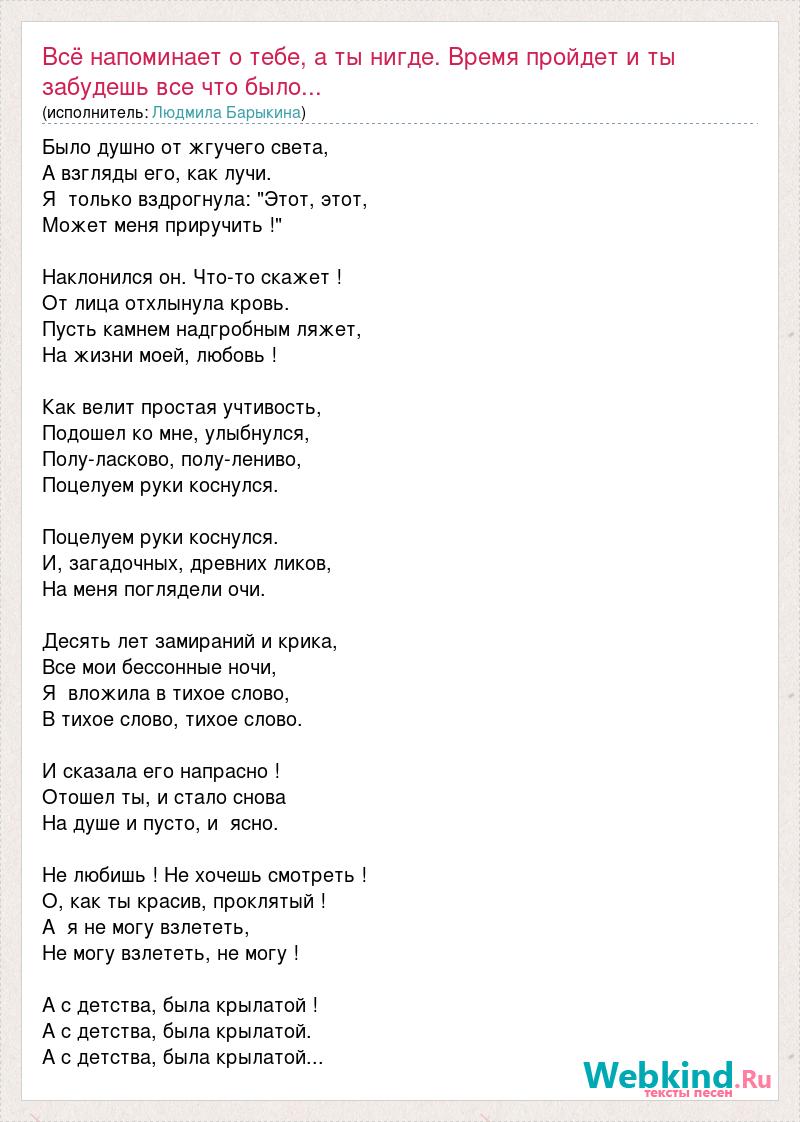 Главная→Исполнители→Людмила Барыкина→Всё напоминает о тебе, а ты нигде. Время пройдет и ты забудешь все что