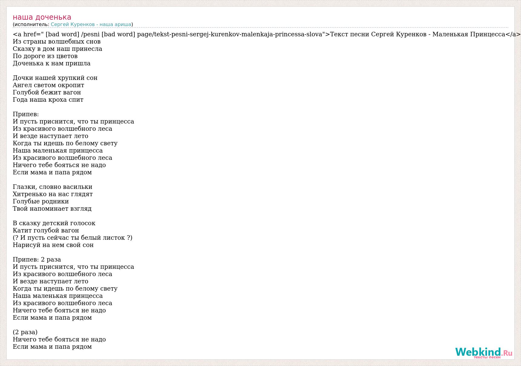 <a href=" [bad word] /pesni [bad word] page/tekst-pesni-sergej-kurenkov-malenkaja-princessa-slova">Текст песни Сергей Куренков - Маленькая Принцесса</a> Из страны волшебных снов Сказку в дом наш принесла По дороге из цветов Доченька к нам пришла Дочки нашей хрупкий сон Ангел светом окропит Голубой бежит вагон Года наша кроха спит Припев: И пусть приснится, что ты принцесса Из красивого волшебного леса И везде наступает лето Когда ты идешь по белому свету Наша маленькая принцесса Из красивого волшебного леса Ничего тебе бояться не надо Если мама и папа рядом Глазки, словно васильки Хитренько на нас глядят Голубые родники Твой напоминает взгляд В сказку детский голосок Катит голубой вагон (? И пусть сейчас ты белый листок ?) Нарисуй на нем свой сон Припев: 2 раза И пусть приснится, что ты принцесса Из красивого волшебного леса И везде наступает лето Когда ты идешь по белому свету Наша маленькая принцесса Из красивого волшебного леса Ничего тебе бояться не надо Если мама и папа рядом (2 раза) Ничего тебе бояться не надо Если мама и папа рядом