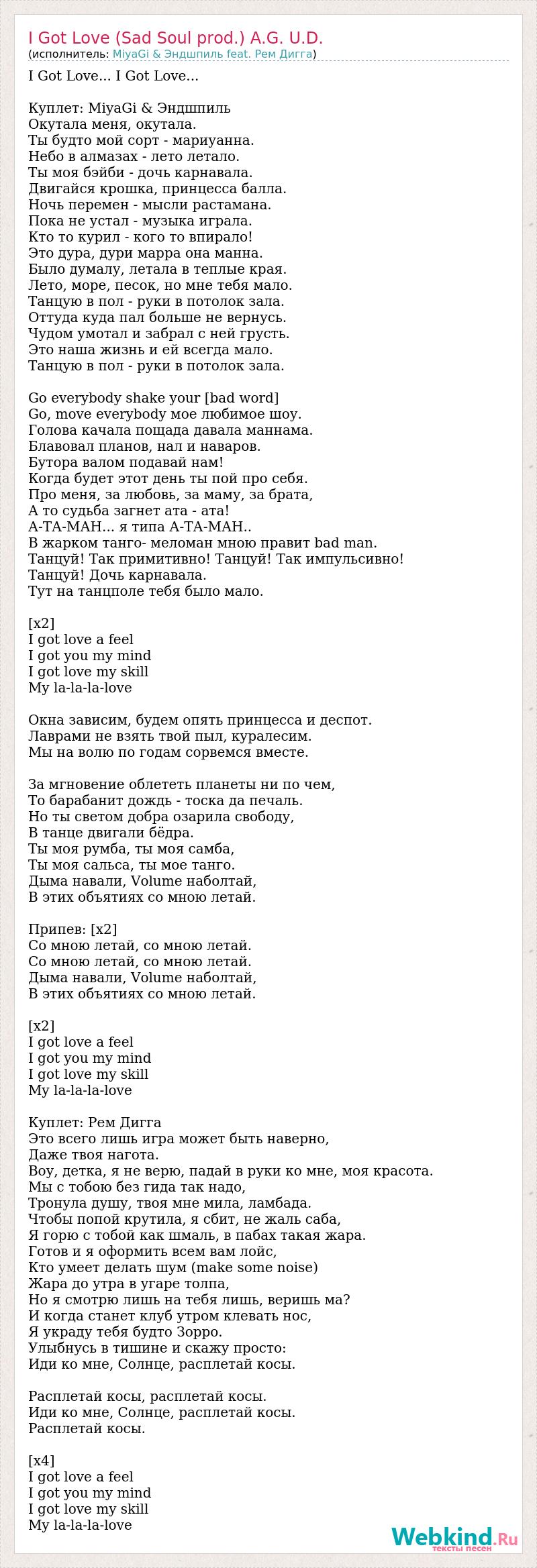 I Got Love... I Got Love... Куплет: MiyaGi & Эндшпиль Окутала меня, окутала. Ты будто мой сорт - мариуанна. Небо в алмазах - лето летало. Ты моя бэйби - дочь карнавала. Двигайся крошка, принцесса балла. Ночь перемен - мысли растамана. Пока не устал - музыка играла. Кто то курил - кого то впирало! Это дура, дури марра она манна. Было думалу, летала в теплые края. Лето, море, песок, но мне тебя мало. Танцую в пол - руки в потолок зала. Оттуда куда пал больше не вернусь. Чудом умотал и забрал с ней грусть. Это наша жизнь и ей всегда мало. Танцую в пол - руки в потолок зала. Go everybody shake your [bad word] Go, move everybody мое любимое шоу. Голова качала пощада давала маннама. Блавовал планов, нал и наваров. Бутора валом подавай нам! Когда будет этот день ты пой про себя. Про меня, за любовь, за маму, за брата, А то судьба загнет ата - ата! А-ТА-МАН... я типа А-ТА-МАН.. В жарком танго- меломан мною правит bad man. Танцуй! Так примитивно! Танцуй! Так импульсивно! Танцуй! Дочь карнавала. Тут на танцполе тебя было мало. [x2] I got love a feel I got you my mind I got love my skill My la-la-la-love Окна зависим, будем опять принцесса и деспот. Лаврами не взять твой пыл, куралесим. Мы на волю по годам сорвемся вместе. За мгновение облететь планеты ни по чем, То барабанит дождь - тоска да печаль. Но ты светом добра озарила свободу, В танце двигали бёдра. Ты моя румба, ты моя самба, Ты моя сальса, ты мое танго. Дыма навали, Volume наболтай, В этих объятиях со мною летай. Припев: [х2] Со мною летай, со мною летай. Со мною летай, со мною летай. Дыма навали, Volume наболтай, В этих объятиях со мною летай. [х2] I got love a feel I got you my mind I got love my skill My la-la-la-love Куплет: Рем Дигга Это всего лишь игра может быть наверно, Даже твоя нагота. Воу, детка, я не верю, падай в руки ко мне, моя красота. Мы с тобою без гида так надо, Тронула душу, твоя мне мила, ламбада. Чтобы попой крутила, я сбит, не жаль саба, Я горю с тобой как шмаль, в пабах такая жара. Готов и я оформить всем вам лойс, Кто умеет делать шум (make some noise) Жара до утра в угаре толпа, Но я смотрю лишь на тебя лишь, веришь ма? И когда станет клуб утром клевать нос, Я украду тебя будто Зорро. Улыбнусь в тишине и скажу просто: Иди ко мне, Солнце, расплетай косы. Расплетай косы, расплетай косы. Иди ко мне, Солнце, расплетай косы. Расплетай косы. [x4] I got love a feel I got you my mind I got love my skill My la-la-la-love