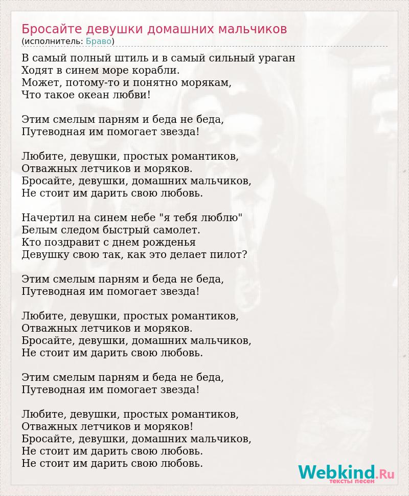 В самый полный штиль и в самый сильный ураган Ходят в синем море корабли. Может, потому-то и понятно морякам, Что такое океан любви! Этим смелым парням и беда не беда, Путеводная им помогает звезда! Любите, девушки, простых романтиков, Отважных летчиков и моряков. Бросайте, девушки, домашних мальчиков, Не стоит им дарить свою любовь. Начертил на синем небе "я тебя люблю" Белым следом быстрый самолет. Кто поздравит с днем рожденья Девушку свою так, как это делает пилот? Этим смелым парням и беда не беда, Путеводная им помогает звезда! Любите, девушки, простых романтиков, Отважных летчиков и моряков. Бросайте, девушки, домашних мальчиков, Не стоит им дарить свою любовь. Этим смелым парням и беда не беда, Путеводная им помогает звезда! Любите, девушки, простых романтиков, Отважных летчиков и моряков! Бросайте, девушки, домашних мальчиков, Не стоит им дарить свою любовь. Не стоит им дарить свою любовь.