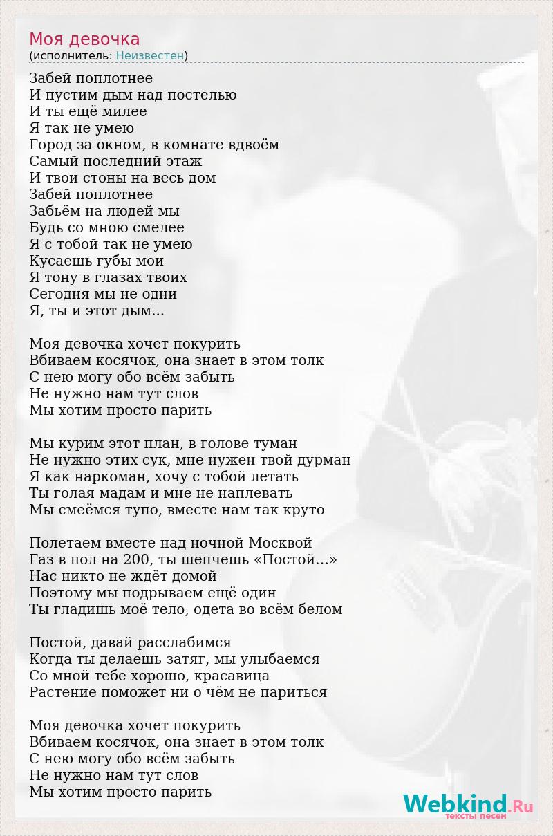 Забей поплотнее И пустим дым над постелью И ты ещё милее Я так не умею Город за окном, в комнате вдвоём Самый последний этаж И твои стоны на весь дом Забей поплотнее Забьём на людей мы Будь со мною смелее Я с тобой так не умею Кусаешь губы мои Я тону в глазах твоих Сегодня мы не одни Я, ты и этот дым... Моя девочка хочет покурить Вбиваем косячок, она знает в этом толк С нею могу обо всём забыть Не нужно нам тут слов Мы хотим просто парить Мы курим этот план, в голове туман Не нужно этих сук, мне нужен твой дурман Я как наркоман, хочу с тобой летать Ты голая мадам и мне не наплевать Мы смеёмся тупо, вместе нам так круто Полетаем вместе над ночной Москвой Газ в пол на 200, ты шепчешь «Постой…» Нас никто не ждёт домой Поэтому мы подрываем ещё один Ты гладишь моё тело, одета во всём белом Постой, давай расслабимся Когда ты делаешь затяг, мы улыбаемся Со мной тебе хорошо, красавица Растение поможет ни о чём не париться Моя девочка хочет покурить Вбиваем косячок, она знает в этом толк С нею могу обо всём забыть Не нужно нам тут слов Мы хотим просто парить