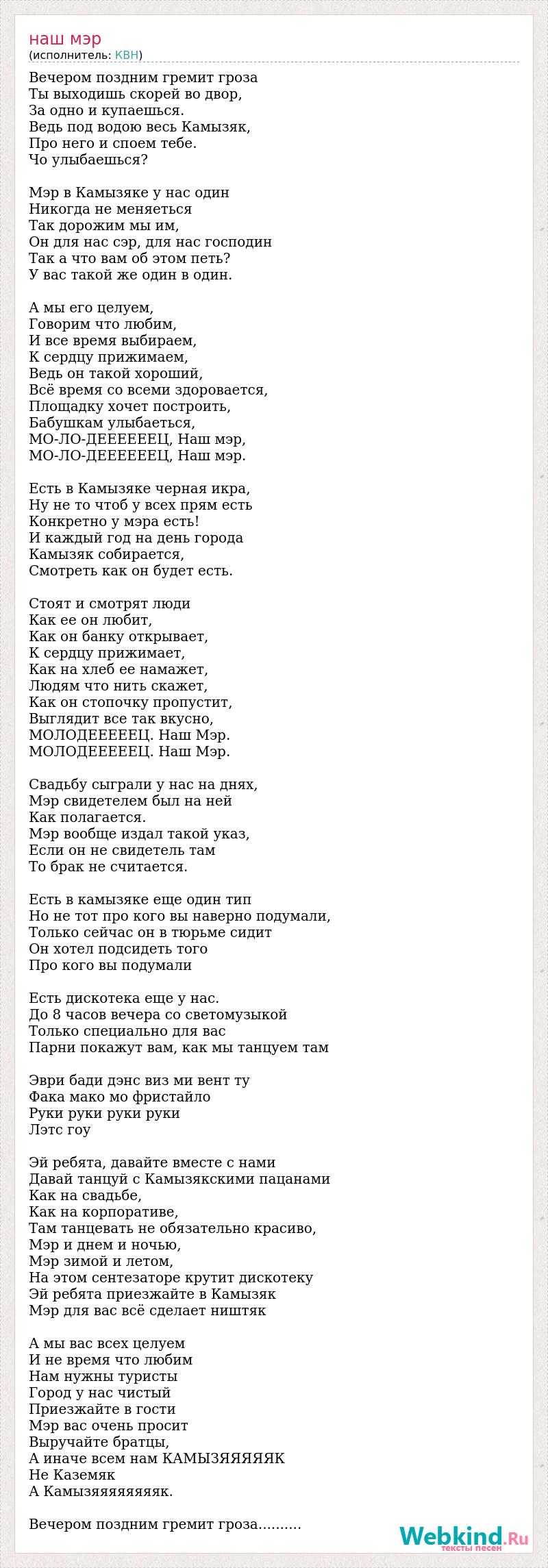 Вечером поздним гремит гроза Ты выходишь скорей во двор, За одно и купаешься. Ведь под водою весь Камызяк, Про него и споем тебе. Чо улыбаешься? Мэр в Камызяке у нас один Никогда не меняеться Так дорожим мы им, Он для нас сэр, для нас господин Так а что вам об этом петь? У вас такой же один в один. А мы его целуем, Говорим что любим, И все время выбираем, К сердцу прижимаем, Ведь он такой хороший, Всё время со всеми здоровается, Площадку хочет построить, Бабушкам улыбаеться, МО-ЛО-ДЕЕЕЕЕЕЦ, Наш мэр, МО-ЛО-ДЕЕЕЕЕЕЦ, Наш мэр. Есть в Камызяке черная икра, Ну не то чтоб у всех прям есть Конкретно у мэра есть! И каждый год на день города Камызяк собирается, Смотреть как он будет есть. Стоят и смотрят люди Как ее он любит, Как он банку открывает, К сердцу прижимает, Как на хлеб ее намажет, Людям что нить скажет, Как он стопочку пропустит, Выглядит все так вкусно, МОЛОДЕЕЕЕЕЦ. Наш Мэр. МОЛОДЕЕЕЕЕЦ. Наш Мэр. Свадьбу сыграли у нас на днях, Мэр свидетелем был на ней Как полагается. Мэр вообще издал такой указ, Если он не свидетель там То брак не считается. Есть в камызяке еще один тип Но не тот про кого вы наверно подумали, Только сейчас он в тюрьме сидит Он хотел подсидеть того Про кого вы подумали Есть дискотека еще у нас. До 8 часов вечера со светомузыкой Только специально для вас Парни покажут вам, как мы танцуем там Эври бади дэнс виз ми вент ту Фака мако мо фристайло Руки руки руки руки Лэтс гоу Эй ребята, давайте вместе с нами Давай танцуй с Камызякскими пацанами Как на свадьбе, Как на корпоративе, Там танцевать не обязательно красиво, Мэр и днем и ночью, Мэр зимой и летом, На этом сентезаторе крутит дискотеку Эй ребята приезжайте в Камызяк Мэр для вас всё сделает ништяк А мы вас всех целуем И не время что любим Нам нужны туристы Город у нас чистый Приезжайте в гости Мэр вас очень просит Выручайте братцы, А иначе всем нам КАМЫЗЯЯЯЯЯК Не Каземяк А Камызяяяяяяяяк. Вечером поздним гремит гроза..........