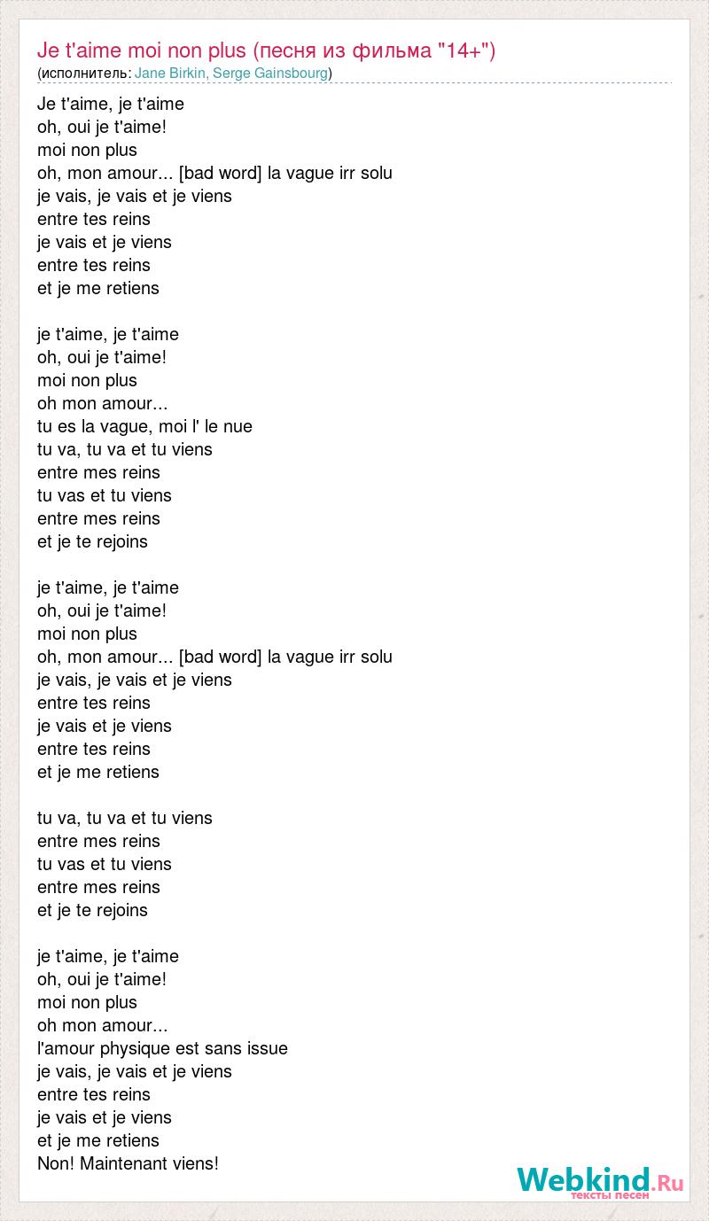 Je t'aime, je t'aime oh, oui je t'aime! moi non plus oh, mon amour... [bad word] la vague irr solu je vais, je vais et je viens entre tes reins je vais et je viens entre tes reins et je me retiens je t'aime, je t'aime oh, oui je t'aime! moi non plus oh mon amour... tu es la vague, moi l' le nue tu va, tu va et tu viens entre mes reins tu vas et tu viens entre mes reins et je te rejoins je t'aime, je t'aime oh, oui je t'aime! moi non plus oh, mon amour... [bad word] la vague irr solu je vais, je vais et je viens entre tes reins je vais et je viens entre tes reins et je me retiens tu va, tu va et tu viens entre mes reins tu vas et tu viens entre mes reins et je te rejoins je t'aime, je t'aime oh, oui je t'aime! moi non plus oh mon amour... l'amour physique est sans issue je vais, je vais et je viens entre tes reins je vais et je viens et je me retiens Non! Maintenant viens!
