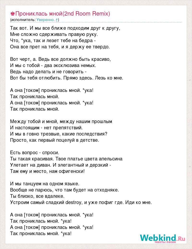 Так вот. И мы все ближе подходим друг к другу, Мне сложно сдерживать правую руку. Что, *ука, так и лезет тебе на бедра - Она все прет на тебя, и я держу ее твердо. Вот черт, а. Ведь все должно быть красиво, И мы с тобой - два эксклюзива немых. Ведь надо делать и не говорить - Вот бы тебя отлюбить. Прямо здесь. Лезь ко мне. А она [током] прониклась мной. *ука! Так прониклась мной. А она [током] прониклась мной. *ука! Так прониклась мной. Между тобой и мной, между нашим прошлым И настоящим - нет препятствий. И мы в говно трезвые, какие последствия? Просто, как первый поцелуй в детстве. Есть вопрос - спроси. Ты такая красивая. Твое платье цвета апельсина Улетает на диван. И элегантный и дерзкий - Там ему и место, нам офигенски! И мы танцуем на одном языке. Вообще не парюсь, что там будет на отходняке. Ты близко, все вдалеке. Устроим самый сладкий destroy, и уже пофиг где. Иди ко мне. А она [током] прониклась мной. *ука! Так прониклась мной. *ука! А она [током] прониклась мной. *ука! Так прониклась мной. *ука!
