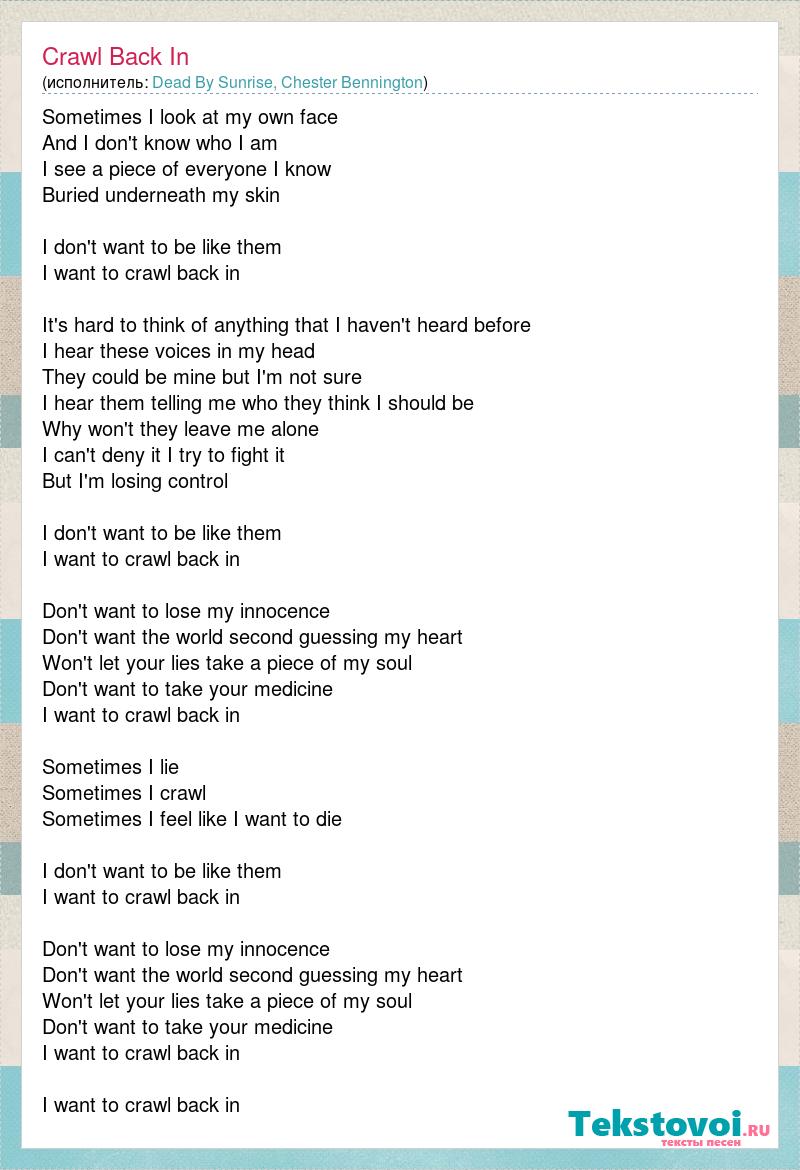 Sometimes I look at my own face And I don't know who I am I see a piece of everyone I know Buried underneath my skin I don't want to be like them I want to crawl back in It's hard to think of anything that I haven't heard before I hear these voices in my head They could be mine but I'm not sure I hear them telling me who they think I should be Why won't they leave me alone I can't deny it I try to fight it But I'm losing control I don't want to be like them I want to crawl back in Don't want to lose my innocence Don't want the world second guessing my heart Won't let your lies take a piece of my soul Don't want to take your medicine I want to crawl back in Sometimes I lie Sometimes I crawl Sometimes I feel like I want to die I don't want to be like them I want to crawl back in Don't want to lose my innocence Don't want the world second guessing my heart Won't let your lies take a piece of my soul Don't want to take your medicine I want to crawl back in I want to crawl back in