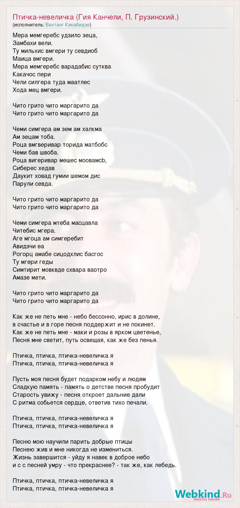 Мера мемгеребс удзило зеца, Замбахи вели. Ту мильхис вмгери ту севдиоб Маица вмгери. Мера мемгеребс варадабис сутква Какачос пери Чели силгера туда маатлес Хода мец вмгери. Чито грито чито маргарито да Чито грито чито маргарито да Чеми симгера ам зем ам халкма Ам зецам тоба. Роца вмгверивар торида матбобс Чеми бав швоба. Роца вигеривар мешес моовамcb, Сиберес хедав Даукит ховад гумии шемом дис Парули севда. Чито грито чито маргарито да Чито грито чито маргарито да Чеми симгера мтеба масцавла Читебис мгера. Аге мгоца ам симгеребит Авидэчи еа Рогорц амабе сицодхлис басгос Ту мгери геды Симтирит мовквде схвара ваотро Амазе мети. Чито грито чито маргарито да Чито грито чито маргарито да Как же не петь мне - небо бессонно, ирис в долине, в счастье и в горе песня поддержит и не покинет. Как же не петь мне - маки и розы в ярком цветенье, Песня мне светит, путь освещая, как же без пенья. Птичка, птичка, птичка-невеличка я Птичка, птичка, птичка-невеличка я Пусть моя песня будет подарком небу и людям Сладкую память - память о детстве песня пробудит Старость увижу - песня откроет дальние дали С ритма собьется сердце, ответив тихо печали. Птичка, птичка, птичка-невеличка я Птичка, птичка, птичка-невеличка я Песню мою научили парить добрые птицы Песнею жив и мне никогда не измениться. Жизнь завершится - уйду я навек в доброе небо и с с песней умру - что прекраснее? - так же, как лебедь. Птичка, птичка, птичка-невеличка я Птичка, птичка, птичка-невеличка я