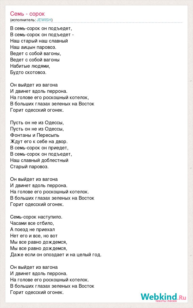 В семь-сорок он подъедет, В семь-сорок он подъедет - Наш старый наш славный Наш аицын паровоз. Ведет с собой вагоны, Ведет с собой вагоны Набитые людями, Будто скотовоз. Он выйдет из вагона И двинет вдоль перрона. На голове его роскошный котелок, В больших глазах зеленых на Восток Горит одесский огонек. Пусть он не из Одессы, Пусть он не из Одессы, Фонтаны и Пересыпь Ждут его к себе на двор. В семь-сорок он приедет, В семь-сорок он подъедет, Наш славный доблестный Старый паровоз. Он выйдет из вагона И двинет вдоль перрона. На голове его роскошный котелок. В больших глазах зеленых на Восток Горит одесский огонек. Семь-сорок наступило. Часами все отбило, А поезд не приехал Нет его и все, но вот Мы все равно дождемся, Мы все равно дождемся, Даже если он опоздает и на целый год. Он выйдет из вагона И двинет вдоль перрона. На голове его роскошный котелок. В больших глазах зеленых на Восток Горит одесский огонек.
