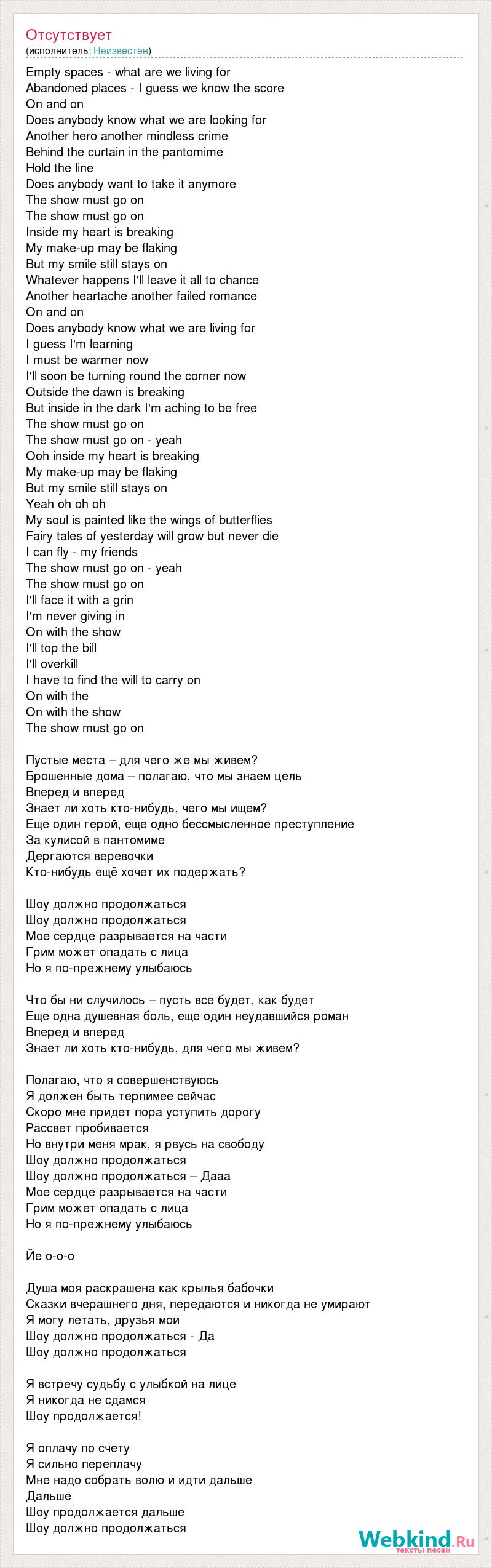 Empty spaces - what are we living for Abandoned places - I guess we know the score On and on Does anybody know what we are looking for Another hero another mindless crime Behind the curtain in the pantomime Hold the line Does anybody want to take it anymore The show must go on The show must go on Inside my heart is breaking My make-up may be flaking But my smile still stays on Whatever happens I'll leave it all to chance Another heartache another failed romance On and on Does anybody know what we are living for I guess I'm learning I must be warmer now I'll soon be turning round the corner now Outside the dawn is breaking But inside in the dark I'm aching to be free The show must go on The show must go on - yeah Ooh inside my heart is breaking My make-up may be flaking But my smile still stays on Yeah oh oh oh My soul is painted like the wings of butterflies Fairy tales of yesterday will grow but never die I can fly - my friends The show must go on - yeah The show must go on I'll face it with a grin I'm never giving in On with the show I'll top the bill I'll overkill I have to find the will to carry on On with the On with the show The show must go on Пустые места – для чего же мы живем? Брошенные дома – полагаю, что мы знаем цель Вперед и вперед Знает ли хоть кто-нибудь, чего мы ищем? Еще один герой, еще одно бессмысленное преступление За кулисой в пантомиме Дергаются веревочки Кто-нибудь ещё хочет их подержать? Шоу должно продолжаться Шоу должно продолжаться Мое сердце разрывается на части Грим может опадать с лица Но я по-прежнему улыбаюсь Что бы ни случилось – пусть все будет, как будет Еще одна душевная боль, еще один неудавшийся роман Вперед и вперед Знает ли хоть кто-нибудь, для чего мы живем? Полагаю, что я совершенствуюсь Я должен быть терпимее сейчас Скоро мне придет пора уступить дорогу Рассвет пробивается Но внутри меня мрак, я рвусь на свободу Шоу должно продолжаться Шоу должно продолжаться – Дааа Мое сердце разрывается на части Грим может опадать с лица Но я по-прежнему улыбаюсь Йе о-о-о Душа моя раскрашена как крылья бабочки Сказки вчерашнего дня, передаются и никогда не умирают Я могу летать, друзья мои Шоу должно продолжаться - Да Шоу должно продолжаться Я встречу судьбу с улыбкой на лице Я никогда не сдамся Шоу продолжается! Я оплачу по счету Я сильно переплачу Мне надо собрать волю и идти дальше Дальше Шоу продолжается дальше Шоу должно продолжаться