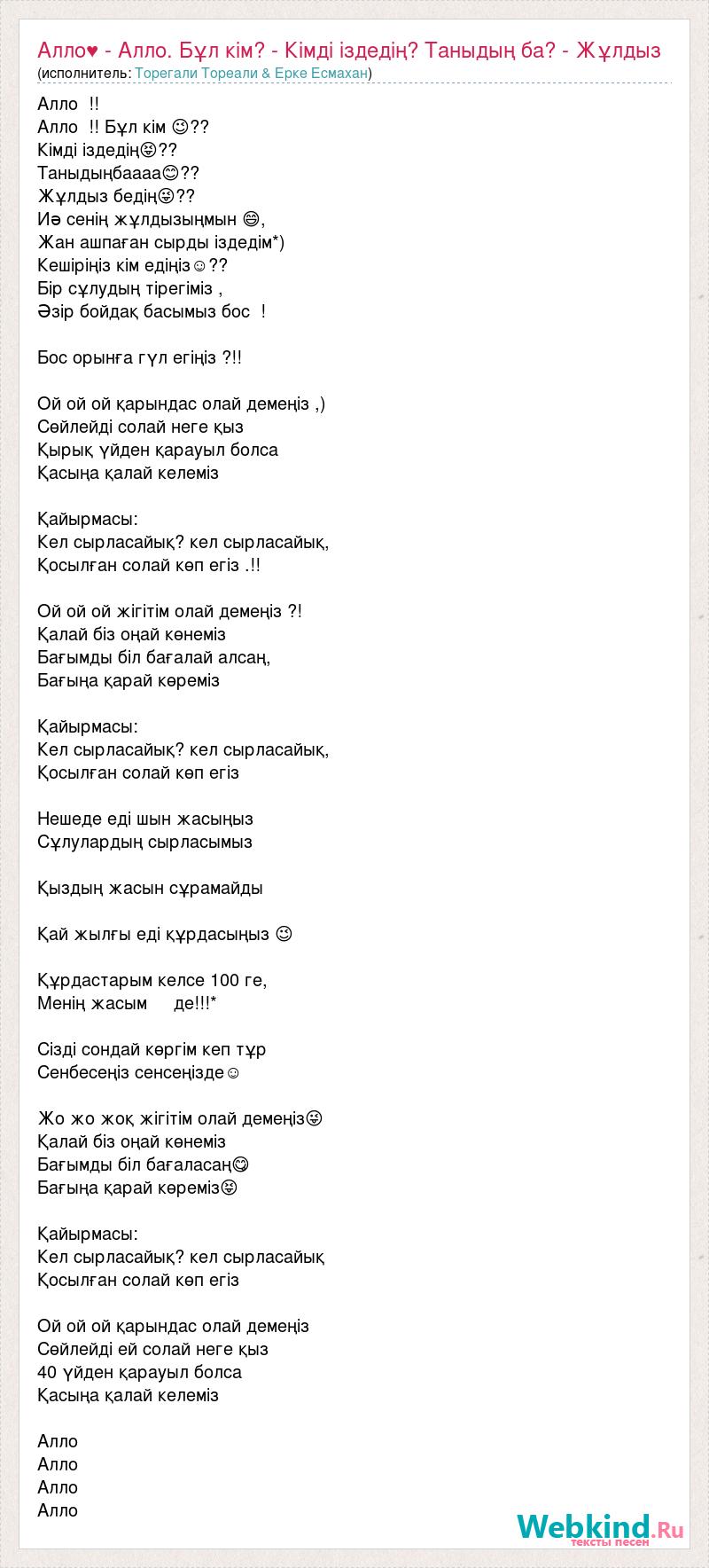 Алло📞 !! Алло📞 !! Бұл кім 😉?? Кімді іздедің😝?? Таныдыңбаааа😊?? Жұлдыз бедің😜?? Иə сенің жұлдызыңмын 😄, Жан ашпаған сырды іздедім*) Кешіріңіз кім едіңіз☺?? Бір сұлудың тірегіміз💑, Əзір бойдақ басымыз бос🚶🏻! Бос орынға гүл егіңіз🌺?!! Ой ой ой қарындас олай демеңіз❎,) Сөйлейді солай неге қыз❓ Қырық үйден қарауыл болса Қасыңа қалай келеміз❗❗ Қайырмасы: Кел сырласайық? кел сырласайық, Қосылған солай көп егіз💑.!! Ой ой ой жігітім олай демеңіз❎?! Қалай біз оңай көнеміз❓ Бағымды біл бағалай алсаң, Бағыңа қарай көреміз❗❗ Қайырмасы: Кел сырласайық? кел сырласайық, Қосылған солай көп егіз💑❗ Нешеде еді шын жасыңыз❓ Сұлулардың сырласымыз❗ Қыздың жасын сұрамайды😬 Қай жылғы еді құрдасыңыз❓😉 Құрдастарым келсе 100 ге, Менің жасым ⃣⃣ де!!!* Сізді сондай көргім кеп тұр 🙈 Сенбесеңіз сенсеңізде☺❗ Жо жо жоқ жігітім олай демеңіз😜❗ Қалай біз оңай көнеміз❗❗ Бағымды біл бағаласаң😋❗ Бағыңа қарай көреміз😝❗ Қайырмасы: Кел сырласайық? кел сырласайық💑 Қосылған солай көп егіз💑💑 Ой ой ой қарындас олай демеңіз❓❌ Сөйлейді ей солай неге қыз❓❓ 40 үйден қарауыл болса Қасыңа қалай келеміз💑❓❓ Алло📞 Алло📞 Алло📞 Алло📞