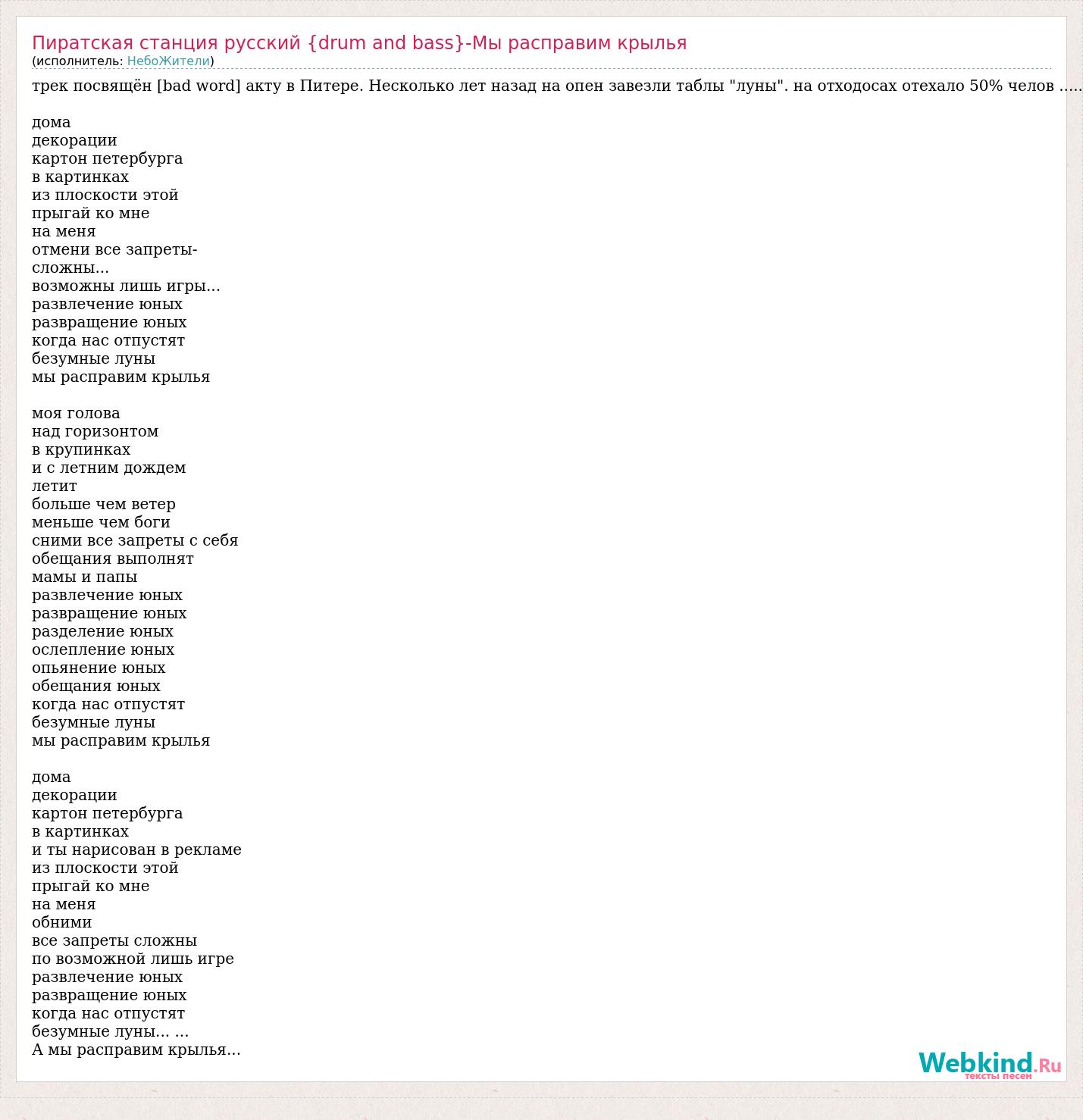 трек посвящён [bad word] акту в Питере. Несколько лет назад на опен завезли таблы "луны". на отходосах отехало 50% челов ..... дома декорации картон петербурга в картинках из плоскости этой прыгай ко мне на меня отмени все запреты- сложны... возможны лишь игры... развлечение юных развращение юных когда нас отпустят безумные луны мы расправим крылья моя голова над горизонтом в крупинках и с летним дождем летит больше чем ветер меньше чем боги сними все запреты с себя обещания выполнят мамы и папы развлечение юных развращение юных разделение юных ослепление юных опьянение юных обещания юных когда нас отпустят безумные луны мы расправим крылья дома декорации картон петербурга в картинках и ты нарисован в рекламе из плоскости этой прыгай ко мне на меня обними все запреты сложны по возможной лишь игре развлечение юных развращение юных когда нас отпустят безумные луны... ... А мы расправим крылья...