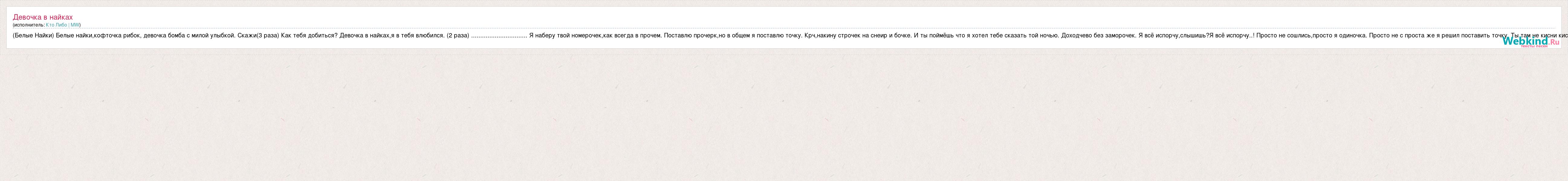 (Белые Найки) Белые найки,кофточка рибок, девочка бомба с милой улыбкой. Скажи(3 раза) Как тебя добиться? Девочка в найках,я в тебя влюбился. (2 раза) ............................... Я наберу твой номерочек,как всегда в прочем. Поставлю прочерк,но в общем я поставлю точку. Крч,накину строчек на снеир и бочке. И ты поймёшь что я хотел тебе сказать той ночью. Доходчево без заморочек. Я всё испорчу,слышишь?Я всё испорчу..! Просто не сошлись,просто я одиночка. Просто не с проста же я решил поставить точку. Ты там не кисни кис