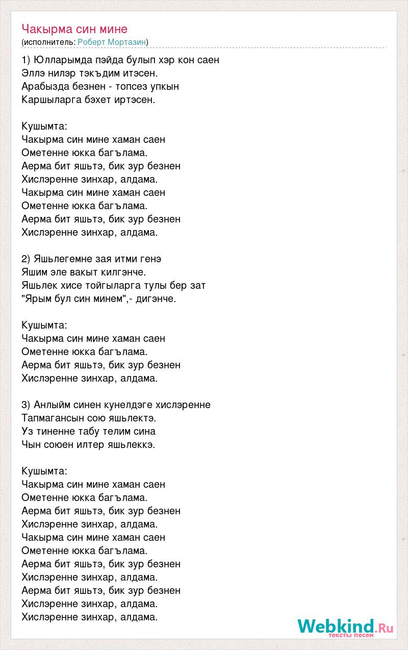 1) Юлларымда пэйда булып хэр кон саен Эллэ нилэр тэкъдим итэсен. Арабызда безнен - топсез упкын Каршыларга бэхет иртэсен. Кушымта: Чакырма син мине хаман саен Ометенне юкка багълама. Аерма бит яшьтэ, бик зур безнен Хислэренне зинхар, алдама. Чакырма син мине хаман саен Ометенне юкка багълама. Аерма бит яшьтэ, бик зур безнен Хислэренне зинхар, алдама. 2) Яшьлегемне зая итми генэ Яшим эле вакыт килгэнче. Яшьлек хисе тойгыларга тулы бер зат "Ярым бул син минем",- дигэнче. Кушымта: Чакырма син мине хаман саен Ометенне юкка багълама. Аерма бит яшьтэ, бик зур безнен Хислэренне зинхар, алдама. 3) Анлыйм синен кунелдэге хислэренне Тапмагансын сою яшьлектэ. Уз тиненне табу телим сина Чын союен илтер яшьлеккэ. Кушымта: Чакырма син мине хаман саен Ометенне юкка багълама. Аерма бит яшьтэ, бик зур безнен Хислэренне зинхар, алдама. Чакырма син мине хаман саен Ометенне юкка багълама. Аерма бит яшьтэ, бик зур безнен Хислэренне зинхар, алдама. Аерма бит яшьтэ, бик зур безнен Хислэренне зинхар, алдама. Хислэренне зинхар, алдама.