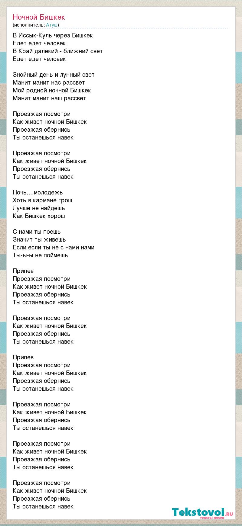 В Иссык-Куль через Бишкек Едет едет человек В Край далекий - ближний свет Едет едет человек Знойный день и лунный свет Манит манит нас рассвет Мой родной ночной Бишкек Манит манит наш рассвет Проезжая посмотри Как живет ночной Бишкек Проезжая обернись Ты останешься навек Проезжая посмотри Как живет ночной Бишкек Проезжая обернись Ты останешься навек Ночь....молодежь Хоть в кармане грош Лучше не найдешь Как Бишкек хорош С нами ты поешь Значит ты живешь Если если ты не с нами нами Ты-ы-ы не поймешь Припев Проезжая посмотри Как живет ночной Бишкек Проезжая обернись Ты останешься навек Проезжая посмотри Как живет ночной Бишкек Проезжая обернись Ты останешься навек Припев Проезжая посмотри Как живет ночной Бишкек Проезжая обернись Ты останешься навек Проезжая посмотри Как живет ночной Бишкек Проезжая обернись Ты останешься навек Проезжая посмотри Как живет ночной Бишкек Проезжая обернись Ты останешься навек Проезжая посмотри Как живет ночной Бишкек Проезжая обернись Ты останешься навек