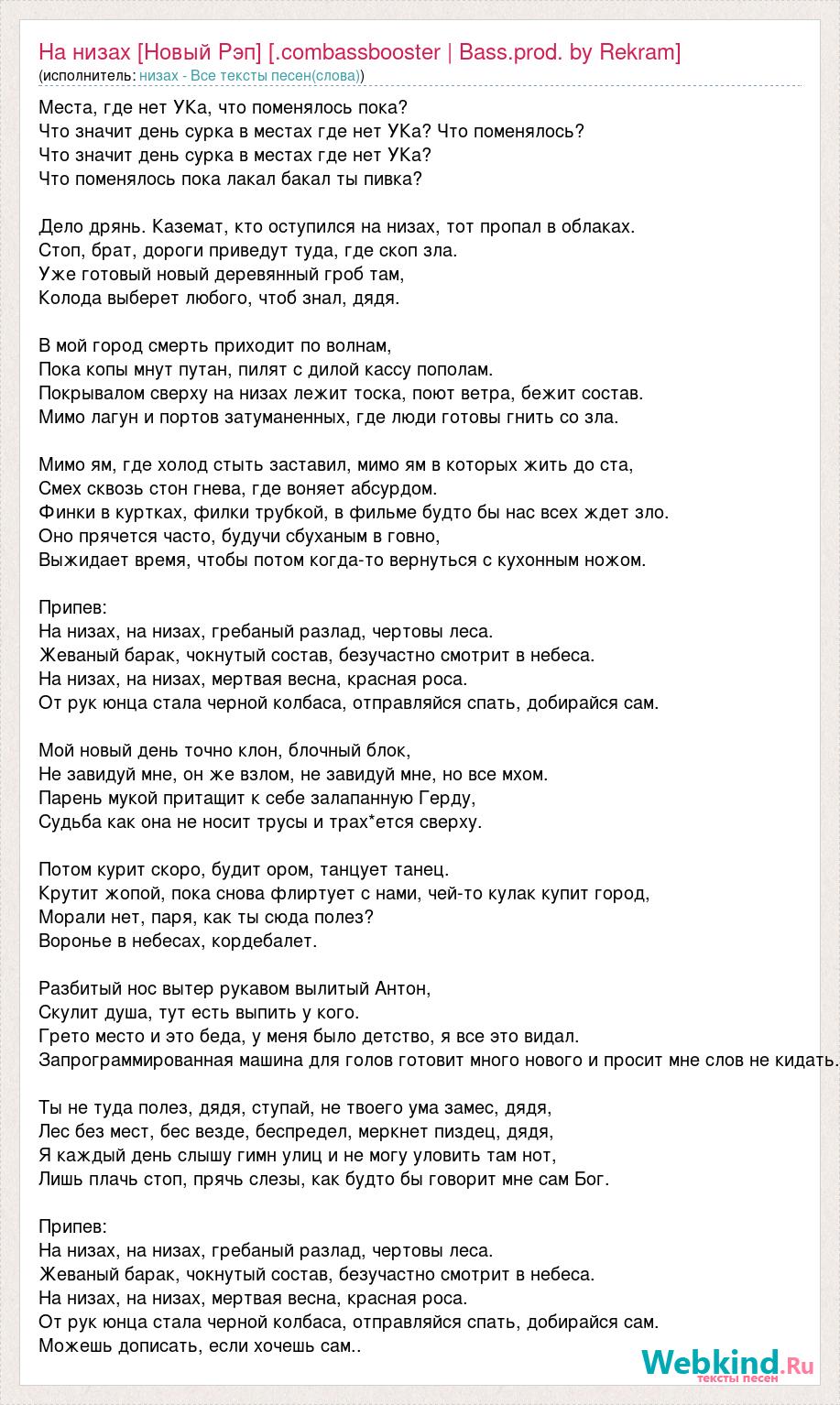 Места, где нет УКа, что поменялось пока? Что значит день сурка в местах где нет УКа? Что поменялось? Что значит день сурка в местах где нет УКа? Что поменялось пока лакал бакал ты пивка? Дело дрянь. Каземат, кто оступился на низах, тот пропал в облаках. Стоп, брат, дороги приведут туда, где скоп зла. Уже готовый новый деревянный гроб там, Колода выберет любого, чтоб знал, дядя. В мой город смерть приходит по волнам, Пока копы мнут путан, пилят с дилой кассу пополам. Покрывалом сверху на низах лежит тоска, поют ветра, бежит состав. Мимо лагун и портов затуманенных, где люди готовы гнить со зла. Мимо ям, где холод стыть заставил, мимо ям в которых жить до ста, Смех сквозь стон гнева, где воняет абсурдом. Финки в куртках, филки трубкой, в фильме будто бы нас всех ждет зло. Оно прячется часто, будучи сбуханым в говно, Выжидает время, чтобы потом когда-то вернуться с кухонным ножом. Припев: На низах, на низах, гребаный разлад, чертовы леса. Жеваный барак, чокнутый состав, безучастно смотрит в небеса. На низах, на низах, мертвая весна, красная роса. От рук юнца стала черной колбаса, отправляйся спать, добирайся сам. Мой новый день точно клон, блочный блок, Не завидуй мне, он же взлом, не завидуй мне, но все мхом. Парень мукой притащит к себе залапанную Герду, Судьба как она не носит трусы и трах*ется сверху. Потом курит скоро, будит ором, танцует танец. Крутит жопой, пока снова флиртует с нами, чей-то кулак купит город, Морали нет, паря, как ты сюда полез? Воронье в небесах, кордебалет. Разбитый нос вытер рукавом вылитый Антон, Скулит душа, тут есть выпить у кого. Грето место и это беда, у меня было детство, я все это видал. Запрограммированная машина для голов готовит много нового и просит мне слов не кидать. Ты не туда полез, дядя, ступай, не твоего ума замес, дядя, Лес без мест, бес везде, беспредел, меркнет пиздец, дядя, Я каждый день слышу гимн улиц и не могу уловить там нот, Лишь плачь стоп, прячь слезы, как будто бы говорит мне сам Бог. Припев: На низах, на низах, гребаный разлад, чертовы леса. Жеваный барак, чокнутый состав, безучастно смотрит в небеса. На низах, на низах, мертвая весна, красная роса. От рук юнца стала черной колбаса, отправляйся спать, добирайся сам. Можешь дописать, если хочешь сам..