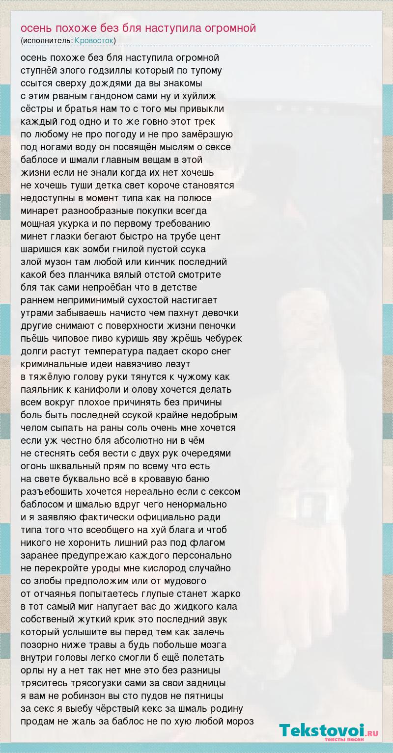 осень похоже без бля наступила огромной ступнёй злого годзиллы который по тупому ссытся сверху дождями да вы знакомы с этим рваным гандоном сами ну и хуйлиж сёстры и братья нам то с того мы привыкли каждый год одно и то же говно этот трек по любому не про погоду и не про замёрзшую под ногами воду он посвящён мыслям о сексе баблосе и шмали главным вещам в этой жизни если не знали когда их нет хочешь не хочешь туши детка свет короче становятся недоступны в момент типа как на полюсе минарет разнообразные покупки всегда мощная укурка и по первому требованию минет глазки бегают быстро на трубе цент шаришся как зомби гнилой пустой ссука злой музон там любой или кинчик последний какой без планчика вялый отстой смотрите бля так сами непроёбан что в детстве раннем неприминимый сухостой настигает утрами забываешь начисто чем пахнут девочки другие снимают с поверхности жизни пеночки пьёшь чиповое пиво куришь яву жрёшь чебурек долги растут температура падает скоро снег криминальные идеи навязчиво лезут в тяжёлую голову руки тянутся к чужому как паяльник к канифоли и олову хочется делать всем вокруг плохое причинять без причины боль быть последней ссукой крайне недобрым челом сыпать на раны соль очень мне хочется если уж честно бля абсолютно ни в чём не стеснять себя вести с двух рук очередями огонь шквальный прям по всему что есть на свете буквально всё в кровавую баню разъебошить хочется нереально если с сексом баблосом и шмалью вдруг чего ненормально и я заявляю фактически официально ради типа того что всеобщего на хуй блага и чтоб никого не хоронить лишний раз под флагом заранее предупрежаю каждого персонально не перекройте уроды мне кислород случайно со злобы предположим или от мудового от отчаянья попытаетесь глупые станет жарко в тот самый миг напугает вас до жидкого кала собственый жуткий крик это последний звук который услышите вы перед тем как залечь позорно ниже травы а будь побольше мозга внутри головы легко смогли б ещё полетать орлы ну а нет так нет мне это без разницы тряситесь трясогузки сами за свои задницы я вам не робинзон вы сто пудов не пятницы за секс я выебу чёрствый кекс за шмаль родину продам не жаль за баблос не по хую любой мороз