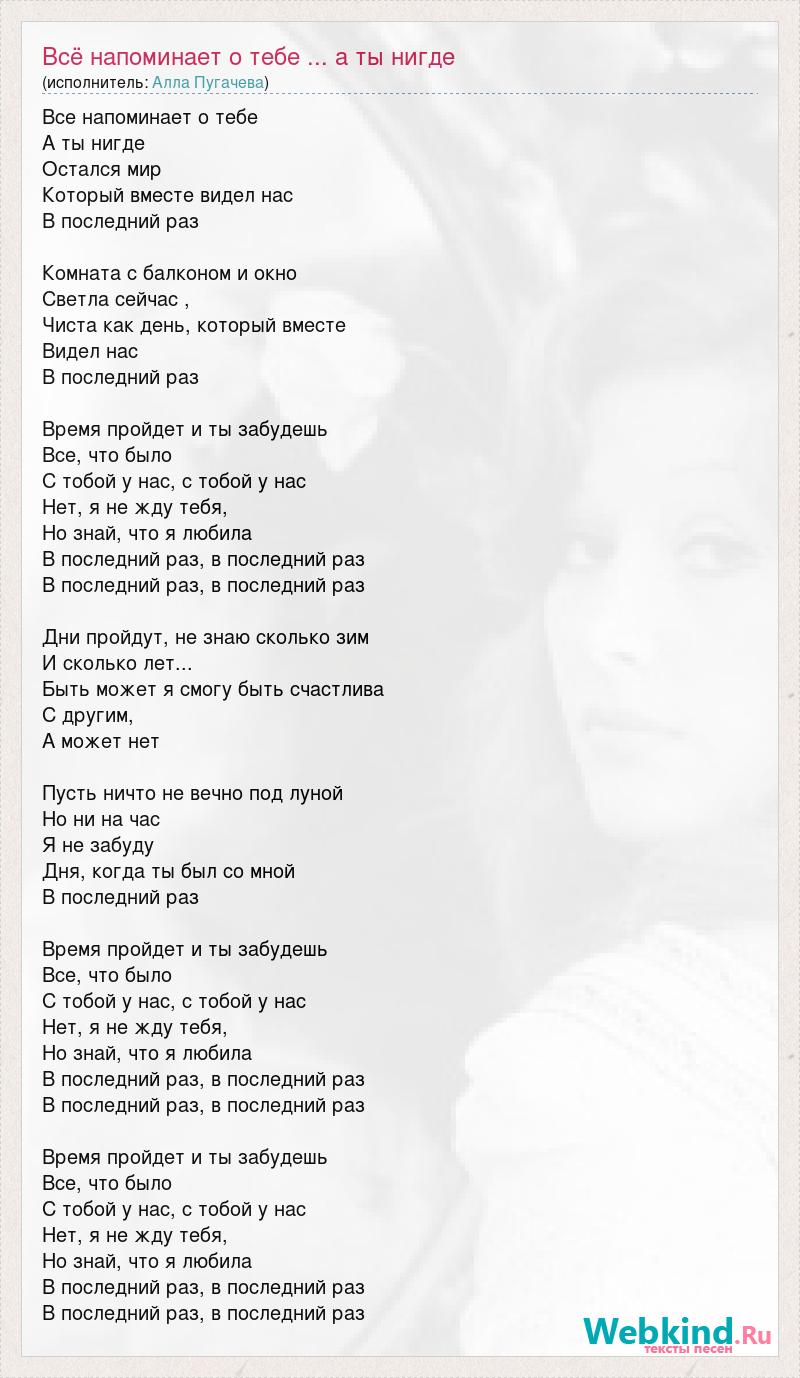 Все напоминает о тебе А ты нигде Остался мир Который вместе видел нас В последний раз Комната с балконом и окно Светла сейчас , Чиста как день, который вместе Видел нас В последний раз Время пройдет и ты забудешь Все, что было С тобой у нас, с тобой у нас Нет, я не жду тебя, Но знай, что я любила В последний раз, в последний раз В последний раз, в последний раз Дни пройдут, не знаю сколько зим И сколько лет... Быть может я смогу быть счастлива С другим, А может нет Пусть ничто не вечно под луной Но ни на час Я не забуду Дня, когда ты был со мной В последний раз Время пройдет и ты забудешь Все, что было С тобой у нас, с тобой у нас Нет, я не жду тебя, Но знай, что я любила В последний раз, в последний раз В последний раз, в последний раз Время пройдет и ты забудешь Все, что было С тобой у нас, с тобой у нас Нет, я не жду тебя, Но знай, что я любила В последний раз, в последний раз В последний раз, в последний раз