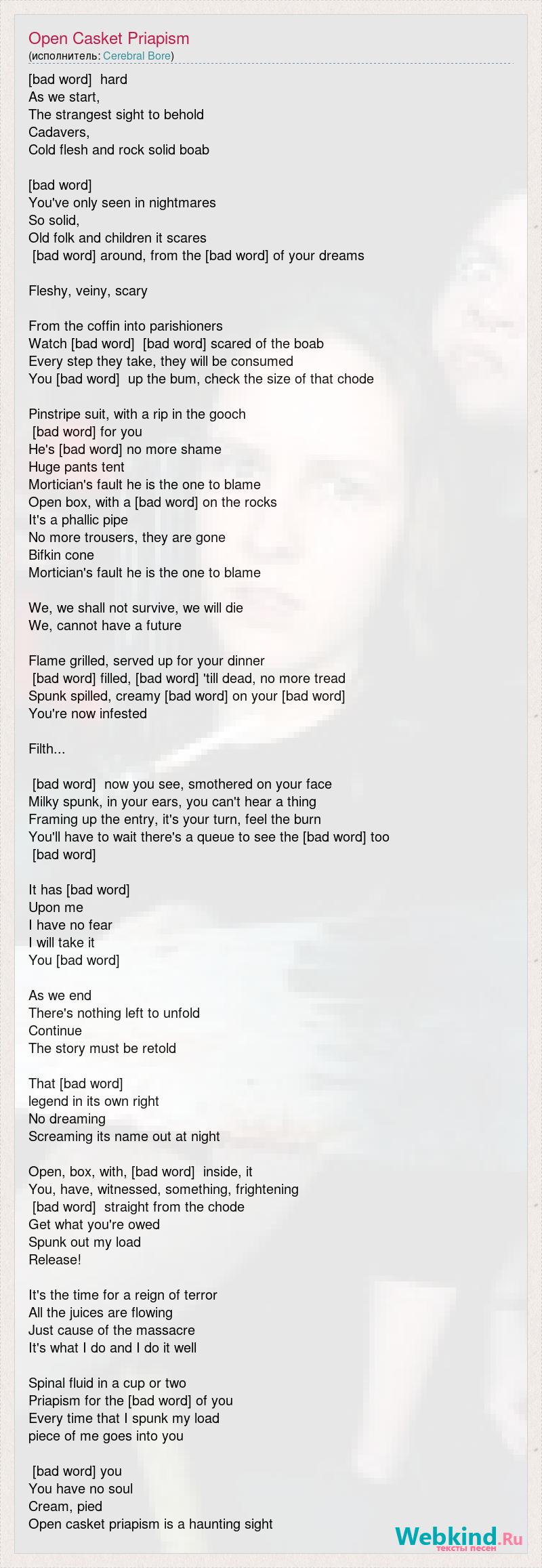 [bad word] hard As we start, The strangest sight to behold Cadavers, Cold flesh and rock solid boab [bad word] You've only seen in nightmares So solid, Old folk and children it scares [bad word] around, from the [bad word] of your dreams Fleshy, veiny, scary From the coffin into parishioners Watch [bad word] [bad word] scared of the boab Every step they take, they will be consumed You [bad word] up the bum, check the size of that chode Pinstripe suit, with a rip in the gooch [bad word] for you He's [bad word] no more shame Huge pants tent Mortician's fault he is the one to blame Open box, with a [bad word] on the rocks It's a phallic pipe No more trousers, they are gone Bifkin cone Mortician's fault he is the one to blame We, we shall not survive, we will die We, cannot have a future Flame grilled, served up for your dinner [bad word] filled, [bad word] 'till dead, no more tread Spunk spilled, creamy [bad word] on your [bad word] You're now infested Filth... [bad word] now you see, smothered on your face Milky spunk, in your ears, you can't hear a thing Framing up the entry, it's your turn, feel the burn You'll have to wait there's a queue to see the [bad word] too [bad word] It has [bad word] Upon me I have no fear I will take it You [bad word] As we end There's nothing left to unfold Continue The story must be retold That [bad word] legend in its own right No dreaming Screaming its name out at night Open, box, with, [bad word] inside, it You, have, witnessed, something, frightening [bad word] straight from the chode Get what you're owed Spunk out my load Release! It's the time for a reign of terror All the juices are flowing Just cause of the massacre It's what I do and I do it well Spinal fluid in a cup or two Priapism for the [bad word] of you Every time that I spunk my load piece of me goes into you [bad word] you You have no soul Cream, pied Open casket priapism is a haunting sight