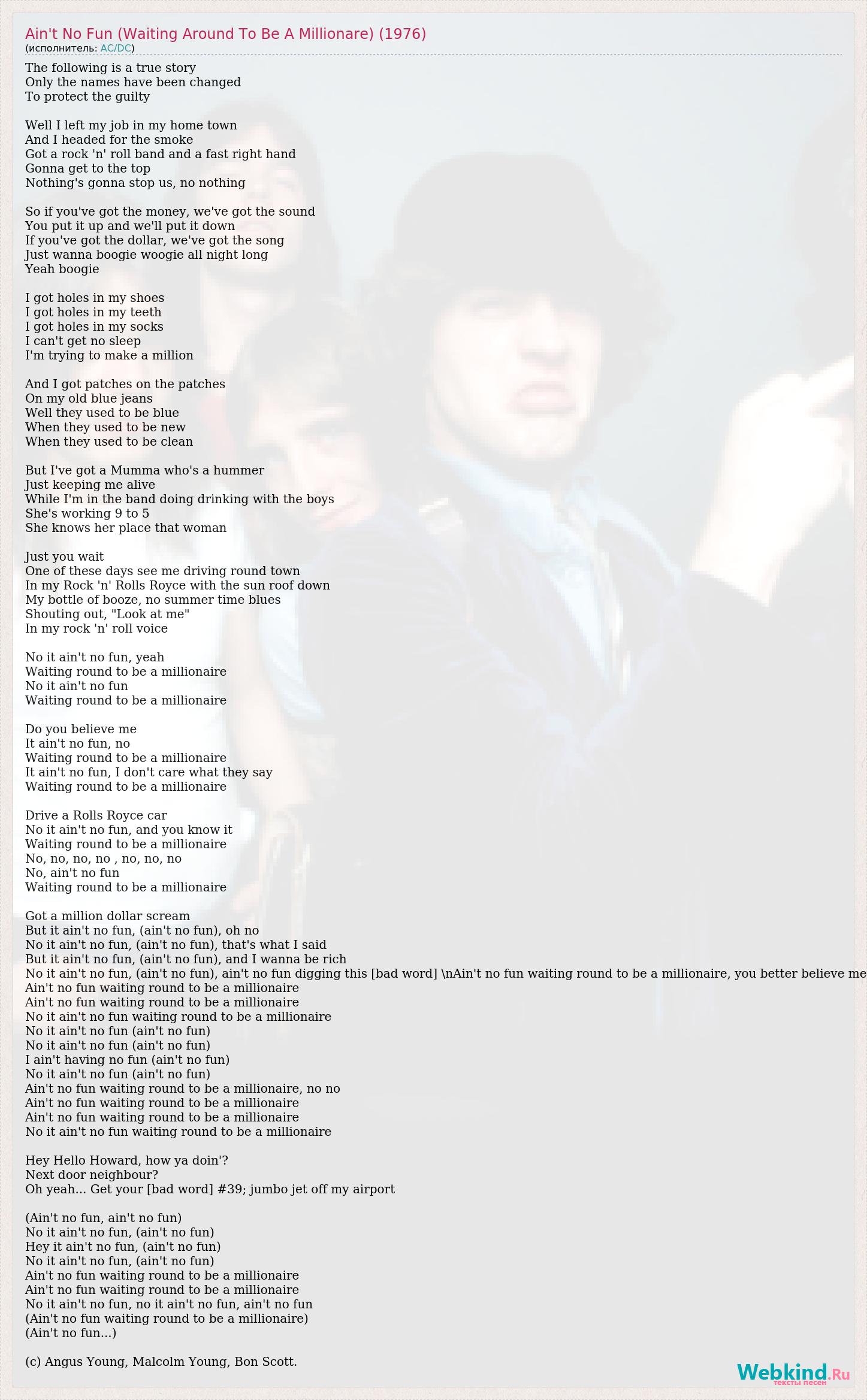 The following is a true story Only the names have been changed To protect the guilty Well I left my job in my home town And I headed for the smoke Got a rock 'n' roll band and a fast right hand Gonna get to the top Nothing's gonna stop us, no nothing So if you've got the money, we've got the sound You put it up and we'll put it down If you've got the dollar, we've got the song Just wanna boogie woogie all night long Yeah boogie I got holes in my shoes I got holes in my teeth I got holes in my socks I can't get no sleep I'm trying to make a million And I got patches on the patches On my old blue jeans Well they used to be blue When they used to be new When they used to be clean But I've got a Mumma who's a hummer Just keeping me alive While I'm in the band doing drinking with the boys She's working 9 to 5 She knows her place that woman Just you wait One of these days see me driving round town In my Rock 'n' Rolls Royce with the sun roof down My bottle of booze, no summer time blues Shouting out, "Look at me" In my rock 'n' roll voice No it ain't no fun, yeah Waiting round to be a millionaire No it ain't no fun Waiting round to be a millionaire Do you believe me It ain't no fun, no Waiting round to be a millionaire It ain't no fun, I don't care what they say Waiting round to be a millionaire Drive a Rolls Royce car No it ain't no fun, and you know it Waiting round to be a millionaire No, no, no, no , no, no, no No, ain't no fun Waiting round to be a millionaire Got a million dollar scream But it ain't no fun, (ain't no fun), oh no No it ain't no fun, (ain't no fun), that's what I said But it ain't no fun, (ain't no fun), and I wanna be rich No it ain't no fun, (ain't no fun), ain't no fun digging this [bad word] \nAin't no fun waiting round to be a millionaire, you better believe me Ain't no fun waiting round to be a millionaire Ain't no fun waiting round to be a millionaire No it ain't no fun waiting round to be a millionaire No it ain't no fun (ain't no fun) No it ain't no fun (ain't no fun) I ain't having no fun (ain't no fun) No it ain't no fun (ain't no fun) Ain't no fun waiting round to be a millionaire, no no Ain't no fun waiting round to be a millionaire Ain't no fun waiting round to be a millionaire No it ain't no fun waiting round to be a millionaire Hey Hello Howard, how ya doin'? Next door neighbour? Oh yeah... Get your [bad word] #39; jumbo jet off my airport (Ain't no fun, ain't no fun) No it ain't no fun, (ain't no fun) Hey it ain't no fun, (ain't no fun) No it ain't no fun, (ain't no fun) Ain't no fun waiting round to be a millionaire Ain't no fun waiting round to be a millionaire No it ain't no fun, no it ain't no fun, ain't no fun (Ain't no fun waiting round to be a millionaire) (Ain't no fun...) (с) Angus Young, Malcolm Young, Bon Scott.