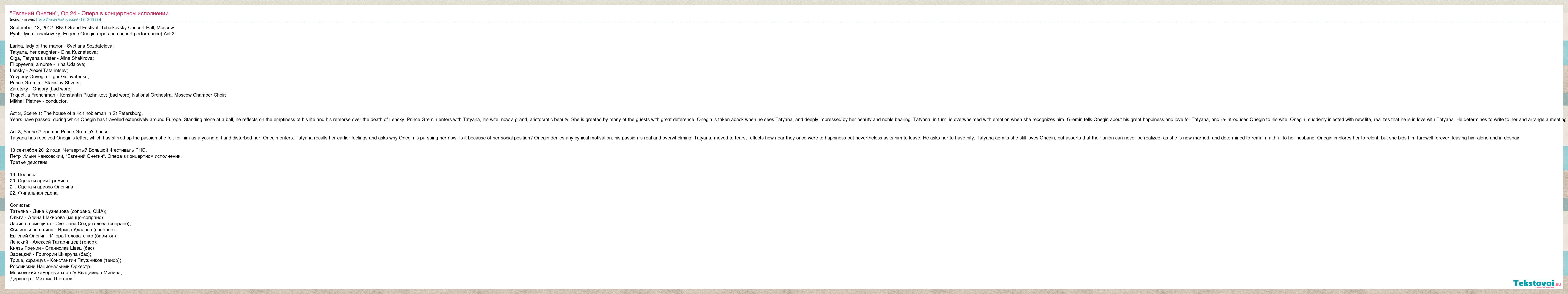 Главная→Исполнители→Петр Ильич Чайковский (1840-1893)→''Евгений Онегин'', Op.24 - Опера в концертном исполне
