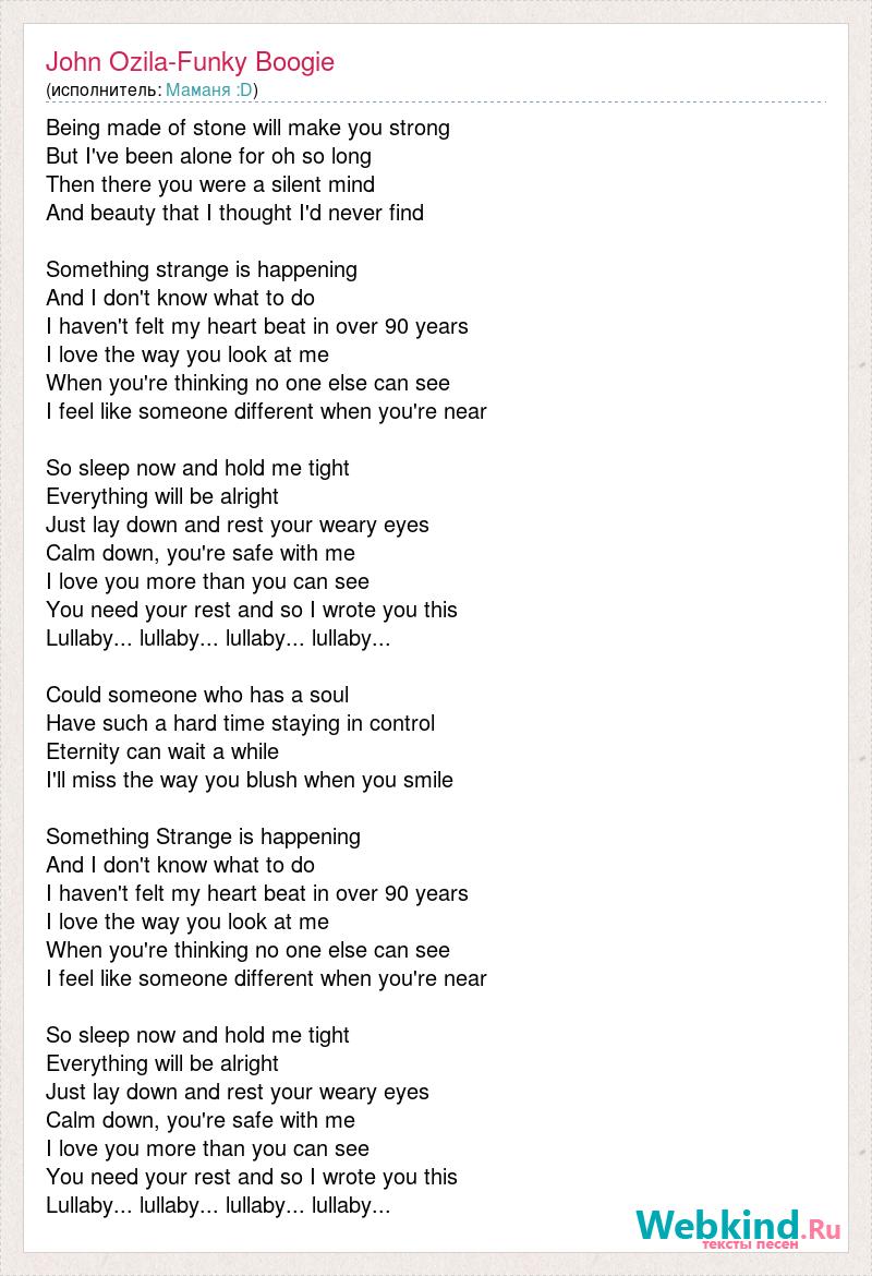 Being made of stone will make you strong But I've been alone for oh so long Then there you were a silent mind And beauty that I thought I'd never find Something strange is happening And I don't know what to do I haven't felt my heart beat in over 90 years I love the way you look at me When you're thinking no one else can see I feel like someone different when you're near So sleep now and hold me tight Everything will be alright Just lay down and rest your weary eyes Calm down, you're safe with me I love you more than you can see You need your rest and so I wrote you this Lullaby... lullaby... lullaby... lullaby... Could someone who has a soul Have such a hard time staying in control Eternity can wait a while I'll miss the way you blush when you smile Something Strange is happening And I don't know what to do I haven't felt my heart beat in over 90 years I love the way you look at me When you're thinking no one else can see I feel like someone different when you're near So sleep now and hold me tight Everything will be alright Just lay down and rest your weary eyes Calm down, you're safe with me I love you more than you can see You need your rest and so I wrote you this Lullaby... lullaby... lullaby... lullaby...