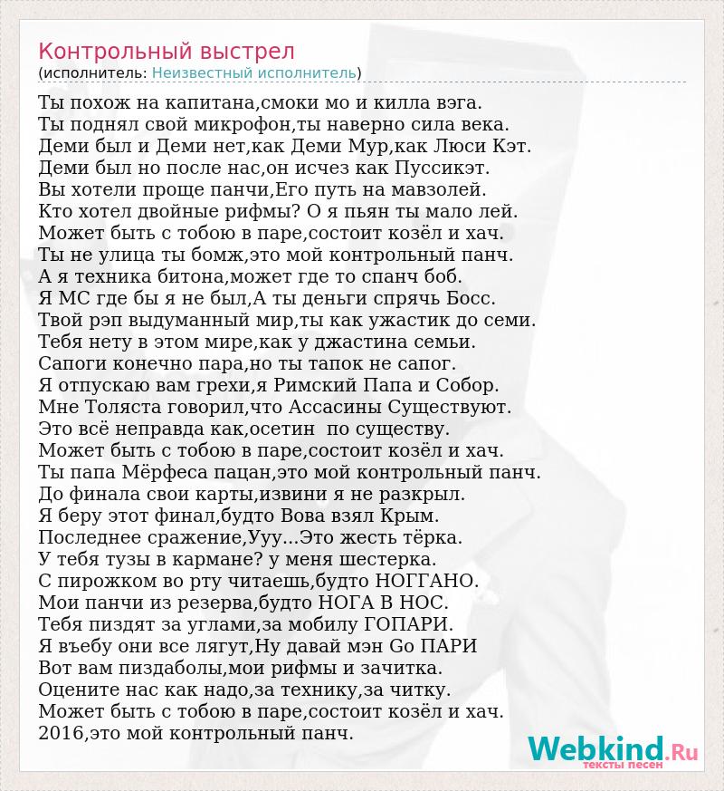 Ты похож на капитана,смоки мо и килла вэга. Ты поднял свой микрофон,ты наверно сила века. Деми был и Деми нет,как Деми Мур,как Люси Кэт. Деми был но после нас,он исчез как Пуссикэт. Вы хотели проще панчи,Его путь на мавзолей. Кто хотел двойные рифмы? О я пьян ты мало лей. Может быть с тобою в паре,состоит козёл и хач. Ты не улица ты бомж,это мой контрольный панч. А я техника битона,может где то спанч боб. Я МС где бы я не был,А ты деньги спрячь Босс. Твой рэп выдуманный мир,ты как ужастик до семи. Тебя нету в этом мире,как у джастина семьи. Сапоги конечно пара,но ты тапок не сапог. Я отпускаю вам грехи,я Римский Папа и Собор. Мне Толяста говорил,что Ассасины Существуют. Это всё неправда как,осетин по существу. Может быть с тобою в паре,состоит козёл и хач. Ты папа Мёрфеса пацан,это мой контрольный панч. До финала свои карты,извини я не разкрыл. Я беру этот финал,будто Вова взял Крым. Последнее сражение,Ууу...Это жесть тёрка. У тебя тузы в кармане? у меня шестерка. С пирожком во рту читаешь,будто НОГГАНО. Мои панчи из резерва,будто НОГА В НОС. Тебя пиздят за углами,за мобилу ГОПАРИ. Я въебу они все лягут,Ну давай мэн Go ПАРИ Вот вам пиздаболы,мои рифмы и зачитка. Оцените нас как надо,за технику,за читку. Может быть с тобою в паре,состоит козёл и хач. 2016,это мой контрольный панч.