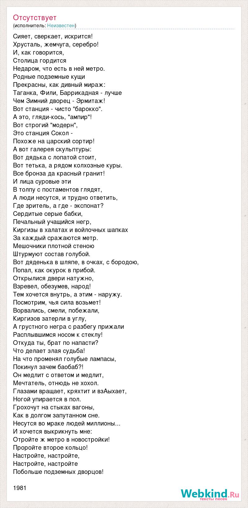 Сияет, сверкает, искрится! Хрусталь, жемчуга, серебро! И, как говорится, Столица гордится Недаром, что есть в ней метро. Родные подземные кущи Прекрасны, как дивный мираж: Таганка, Фили, Баррикадная - лучше Чем Зимний дворец - Эрмитаж! Вот станция - чисто "барокко". А это, гляди-кось, "ампир"! Вот строгий "модерн", Это станция Сокол - Похоже на царский сортир! А вот галерея скульптуры: Вот дядька с лопатой стоит, Вот тетька, а рядом колхозные куры. Все бронза да красный гранит! И лица суровые эти В толпу с постаментов глядят, А люди несутся, и трудно ответить, Где зритель, а где - экспонат? Сердитые серые бабки, Печальный учащийся негр, Киргизы в халатах и войлочных шапках За каждый сражаются метр. Мешочники плотной стеною Штурмуют состав голубой. Вот дяденька в шляпе, в очках, с бородою, Попал, как окурок в прибой. Открылися двери натужно, Взревел, обезумев, народ! Тем хочется внутрь, а этим - наружу. Посмотрим, чья сила возьмет! Ворвались, смели, побежали, Киргизов затерли в углу, А грустного негра с разбегу прижали Расплывшимся носом к стеклу! Откуда ты, брат по напасти? Что делает злая судьба! На что променял голубые лампасы, Покинул зачем баобаб?! Он медлит с ответом и медлит, Мечтатель, отнюдь не хохол. Глазами вращает, кряхтит и взАыхает, Ногой упирается в пол. Грохочут на стыках вагоны, Как в долгом запутанном сне. Несутся во мраке людей миллионы... И хочется выкрикнуть мне: Отройте ж метро в новостройки! Проройте второе кольцо! Настройте, настройте, Настройте, настройте Побольше подземных дворцов! 1981