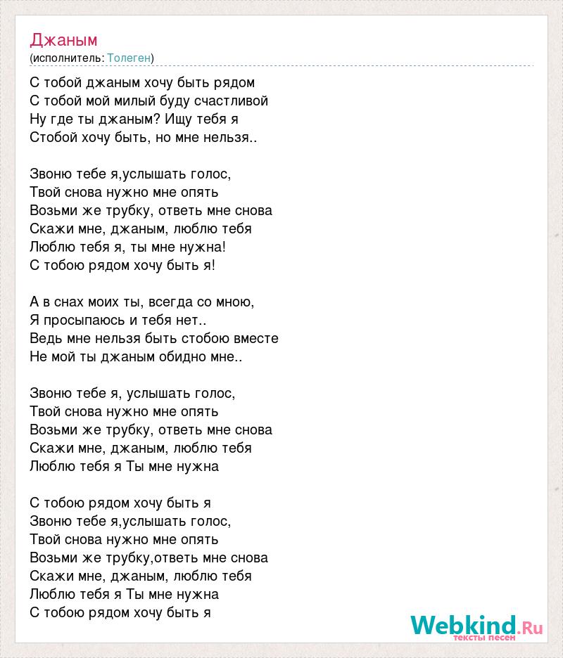 С тобой джаным хочу быть рядом С тобой мой милый буду счастливой Ну где ты джаным? Ищу тебя я Стобой хочу быть, но мне нельзя.. Звоню тебе я,услышать голос, Твой снова нужно мне опять Возьми же трубку, ответь мне снова Скажи мне, джаным, люблю тебя Люблю тебя я, ты мне нужна! С тобою рядом хочу быть я! А в снах моих ты, всегда со мною, Я просыпаюсь и тебя нет.. Ведь мне нельзя быть стобою вместе Не мой ты джаным обидно мне.. Звоню тебе я, услышать голос, Твой снова нужно мне опять Возьми же трубку, ответь мне снова Скажи мне, джаным, люблю тебя Люблю тебя я Ты мне нужна С тобою рядом хочу быть я Звоню тебе я,услышать голос, Твой снова нужно мне опять Возьми же трубку,ответь мне снова Скажи мне, джаным, люблю тебя Люблю тебя я Ты мне нужна С тобою рядом хочу быть я