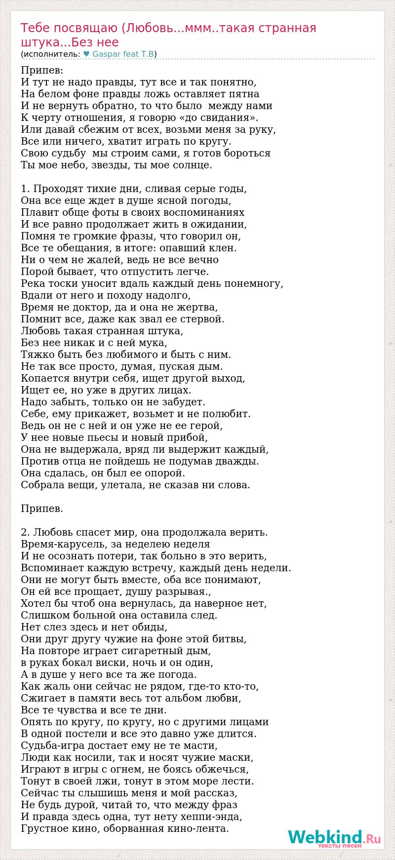 Припев: И тут не надо правды, тут все и так понятно, На белом фоне правды ложь оставляет пятна И не вернуть обратно, то что было между нами К черту отношения, я говорю «до свидания». Или давай сбежим от всех, возьми меня за руку, Все или ничего, хватит играть по кругу. Свою судьбу мы строим сами, я готов бороться Ты мое небо, звезды, ты мое солнце. 1. Проходят тихие дни, сливая серые годы, Она все еще ждет в душе ясной погоды, Плавит обще фоты в своих воспоминаниях И все равно продолжает жить в ожидании, Помня те громкие фразы, что говорил он, Все те обещания, в итоге: опавший клен. Ни о чем не жалей, ведь не все вечно Порой бывает, что отпустить легче. Река тоски уносит вдаль каждый день понемногу, Вдали от него и походу надолго, Время не доктор, да и она не жертва, Помнит все, даже как звал ее стервой. Любовь такая странная штука, Без нее никак и с ней мука, Тяжко быть без любимого и быть с ним. Не так все просто, думая, пуская дым. Копается внутри себя, ищет другой выход, Ищет ее, но уже в других лицах. Надо забыть, только он не забудет. Себе, ему прикажет, возьмет и не полюбит. Ведь он не с ней и он уже не ее герой, У нее новые пьесы и новый прибой, Она не выдержала, вряд ли выдержит каждый, Против отца не пойдешь не подумав дважды. Она сдалась, он был ее опорой. Собрала вещи, улетала, не сказав ни слова. Припев. 2. Любовь спасет мир, она продолжала верить. Время-карусель, за неделею неделя И не осознать потери, так больно в это верить, Вспоминает каждую встречу, каждый день недели. Они не могут быть вместе, оба все понимают, Он ей все прощает, душу разрывая., Хотел бы чтоб она вернулась, да наверное нет, Слишком больной она оставила след. Нет слез здесь и нет обиды, Они друг другу чужие на фоне этой битвы, На повторе играет сигаретный дым, в руках бокал виски, ночь и он один, А в душе у него все та же погода. Как жаль они сейчас не рядом, где-то кто-то, Сжигает в памяти весь тот альбом любви, Все те чувства и все те дни. Опять по кругу, по кругу, но с другими лицами В одной постели и все это давно уже длится. Судьба-игра достает ему не те масти, Люди как носили, так и носят чужие маски, Играют в игры с огнем, не боясь обжечься, Тонут в своей лжи, тонут в этом море лести. Сейчас ты слышишь меня и мой рассказ, Не будь дурой, читай то, что между фраз И правда здесь одна, тут нету хеппи-энда, Грустное кино, оборванная кино-лента.