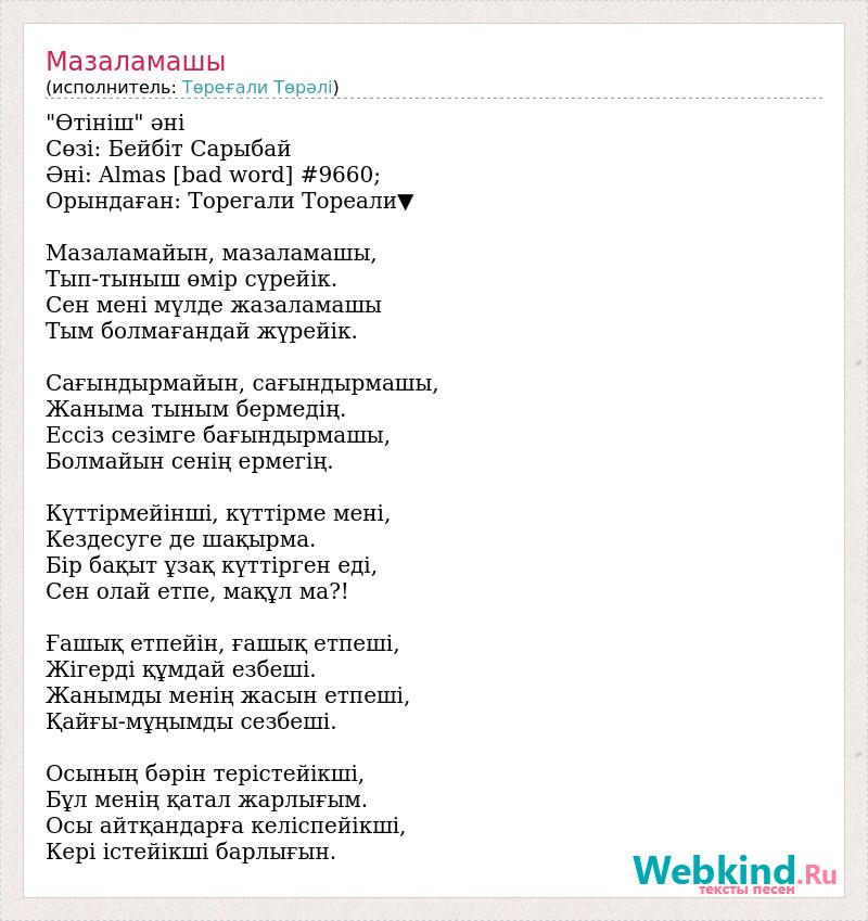"Өтініш" әні 🎵 Сөзі: Бейбіт Сарыбай Əні: Almas [bad word] #9660; Орындаған: Торегали Тореали▼ Мазаламайын, мазаламашы, Тып-тыныш өмір сүрейік. Сен мені мүлде жазаламашы Тым болмағандай жүрейік. Сағындырмайын, сағындырмашы, Жаныма тыным бермедің. Ессіз сезімге бағындырмашы, Болмайын сенің ермегің. Күттірмейінші, күттірме мені, Кездесуге де шақырма. Бір бақыт ұзақ күттірген еді, Сен олай етпе, мақұл ма?! Ғашық етпейін, ғашық етпеші, Жігерді құмдай езбеші. Жанымды менің жасын етпеші, Қайғы-мұңымды сезбеші. Осының бәрін терістейікші, Бұл менің қатал жарлығым. Осы айтқандарға келіспейікші, Кері істейікші барлығын.
