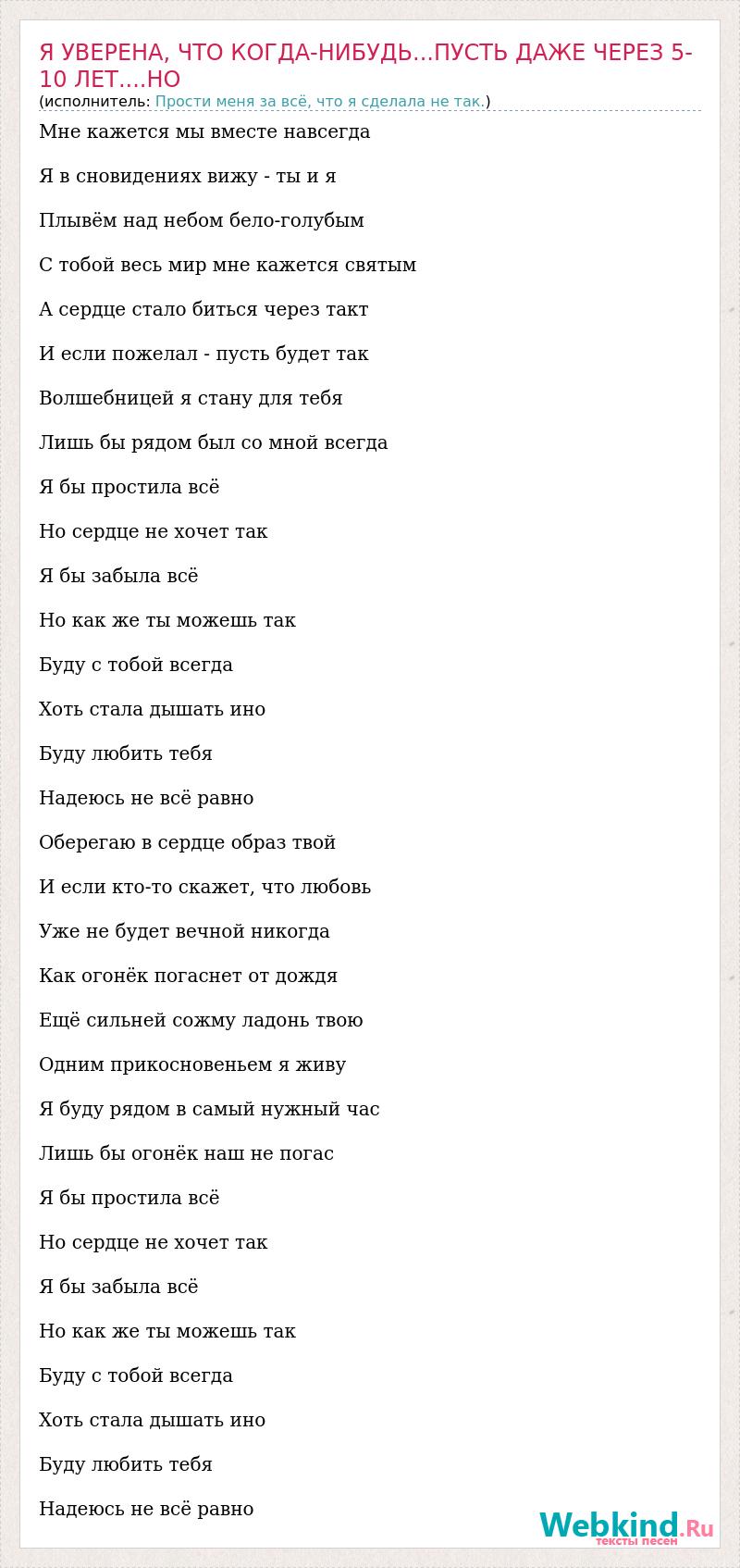 Главная→Исполнители→Прости меня за всё, что я сделала не так.→Я УВЕРЕНА, ЧТО КОГДА-НИБУДЬ...ПУСТЬ ДАЖЕ ЧЕРЕЗ 5-10 ЛЕТ....НО