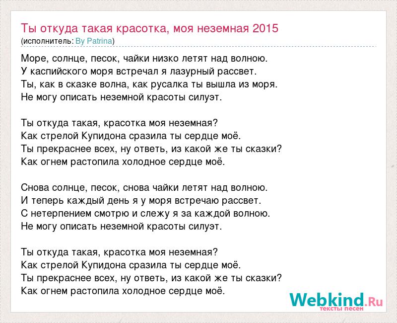 Море, солнце, песок, чайки низко летят над волною. У каспийского моря встречал я лазурный рассвет. Ты, как в сказке волна, как русалка ты вышла из моря. Не могу описать неземной красоты силуэт. Ты откуда такая, красотка моя неземная? Как стрелой Купидона сразила ты сердце моё. Ты прекраснее всех, ну ответь, из какой же ты сказки? Как огнем растопила холодное сердце моё. Снова солнце, песок, снова чайки летят над волною. И теперь каждый день я у моря встречаю рассвет. С нетерпением смотрю и слежу я за каждой волною. Не могу описать неземной красоты силуэт. Ты откуда такая, красотка моя неземная? Как стрелой Купидона сразила ты сердце моё. Ты прекраснее всех, ну ответь, из какой же ты сказки? Как огнем растопила холодное сердце моё.