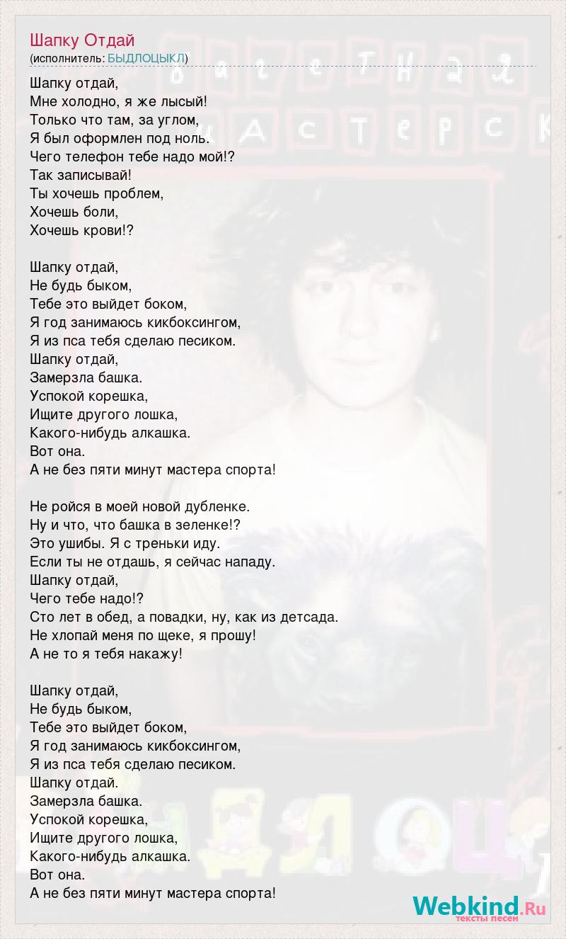 Шапку отдай, Мне холодно, я же лысый! Только что там, за углом, Я был оформлен под ноль. Чего телефон тебе надо мой!? Так записывай! Ты хочешь проблем, Хочешь боли, Хочешь крови!? Шапку отдай, Не будь быком, Тебе это выйдет боком, Я год занимаюсь кикбоксингом, Я из пса тебя сделаю песиком. Шапку отдай, Замерзла башка. Успокой корешка, Ищите другого лошка, Какого-нибудь алкашка. Вот она. А не без пяти минут мастера спорта! Не ройся в моей новой дубленке. Ну и что, что башка в зеленке!? Это ушибы. Я с треньки иду. Если ты не отдашь, я сейчас нападу. Шапку отдай, Чего тебе надо!? Сто лет в обед, а повадки, ну, как из детсада. Не хлопай меня по щеке, я прошу! А не то я тебя накажу! Шапку отдай, Не будь быком, Тебе это выйдет боком, Я год занимаюсь кикбоксингом, Я из пса тебя сделаю песиком. Шапку отдай. Замерзла башка. Успокой корешка, Ищите другого лошка, Какого-нибудь алкашка. Вот она. А не без пяти минут мастера спорта!