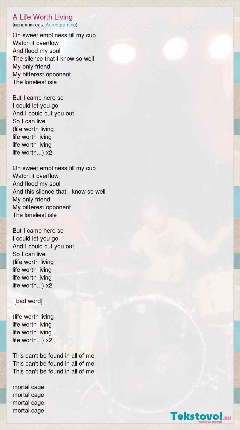 Oh sweet emptiness fill my cup Watch it overflow And flood my soul The silence that I know so well My only friend My bitterest opponent The loneliest isle But I came here so I could let you go And I could cut you out So I can live (life worth living life worth living life worth living life worth...) x2 Oh sweet emptiness fill my cup Watch it overflow And flood my soul And this silence that I know so well My only friend My bitterest opponent The loneliest isle But I came here so I could let you go And I could cut you out So I can live (life worth living life worth living life worth living life worth...) x2 [bad word] (life worth living life worth living life worth living life worth...) x2 This can't be found in all of me This can't be found in all of me This can't be found in all of me mortal cage mortal cage mortal cage mortal cage