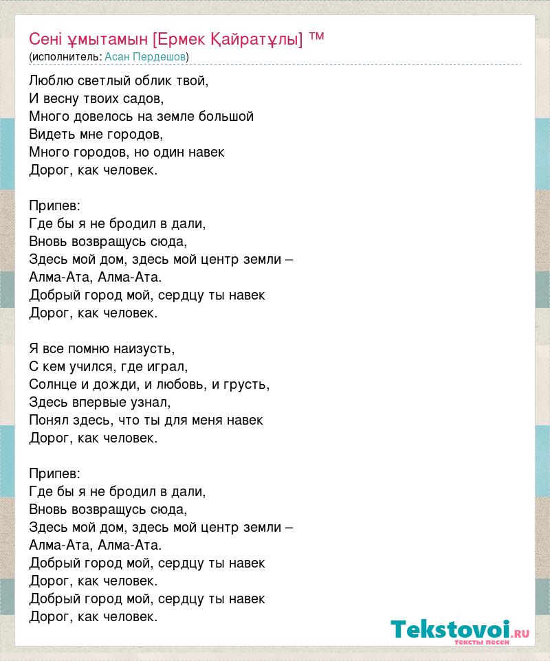 Люблю светлый облик твой, И весну твоих садов, Много довелось на земле большой Видеть мне городов, Много городов, но один навек Дорог, как человек. Припев: Где бы я не бродил в дали, Вновь возвращусь сюда, Здесь мой дом, здесь мой центр земли – Алма-Ата, Алма-Ата. Добрый город мой, сердцу ты навек Дорог, как человек. Я все помню наизусть, С кем учился, где играл, Солнце и дожди, и любовь, и грусть, Здесь впервые узнал, Понял здесь, что ты для меня навек Дорог, как человек. Припев: Где бы я не бродил в дали, Вновь возвращусь сюда, Здесь мой дом, здесь мой центр земли – Алма-Ата, Алма-Ата. Добрый город мой, сердцу ты навек Дорог, как человек. Добрый город мой, сердцу ты навек Дорог, как человек.