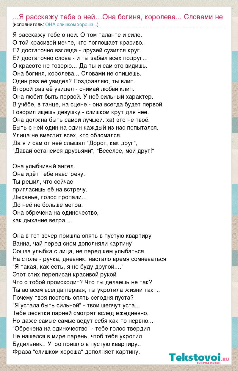 Я расскажу тебе о ней. О том таланте и силе. О той красивой мечте, что поглощает красиво. Ей достаточно взгляда - друзей сузился круг. Ей достаточно слова - и ты забыл всех подруг... О красоте не говорю... Да ты и сам это видишь. Она богиня, королева... Словами не опишешь. Один раз её увидел? Поздравляю, ты влип. Второй раз её увидел - снимай любви клип. Она любит быть первой. У неё сильный характер. В учёбе, в танце, на сцене - она всегда будет первой. Говорил ищешь девушку - слишком крут для неё. Она должна быть самой лучшей. ха) это не твоё. Быть с ней один на один каждый из нас попытался. Улица не вместит всех, кто обломался. Да я и сам от неё слышал "Дорог, как друг", "Давай останемся друзьями", "Веселее, мой друг!" Она улыбчивый ангел. Она идёт тебе навстречу. Ты решил, что сейчас пригласишь её на встречу. Дыханье, голос пропали... До неё не больше метра. Она обречена на одиночество, как дыхание ветра.... Она в тот вечер пришла опять в пустую квартиру Ванна, чай перед сном дополняли картину Сошла улыбка с лица, не перед кем улыбаться На столе - ручка, дневник, настало время сомневаться "Я такая, как есть, я не буду другой...." Этот стих переписан красивой рукой Что с тобой происходит? Что ты делаешь не так? Ты во всем всегда первая, ты укротила жизни такт.. Почему твоя постель опять сегодня пуста? "Я устала быть сильной" - твои шепчут уста... Тебе десятки парней смотрят вслед ежедневно, Но даже самые-самые ведут себя как-то нервно... "Обречена на одиночество" - тебе голос твердил Не нашелся в мире парень, чтоб тебя укротил Будильник.. Утро пришло в пустую квартиру.. Фраза "слишком хороша" дополняет картину.