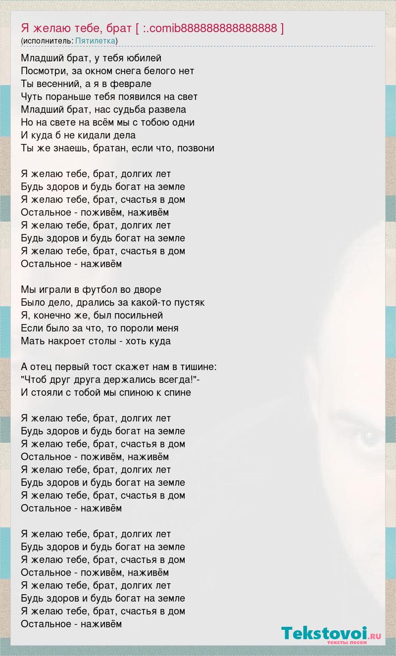 Младший брат, у тебя юбилей Посмотри, за окном снега белого нет Ты весенний, а я в феврале Чуть пораньше тебя появился на свет Младший брат, нас судьба развела Но на свете на всём мы с тобою одни И куда б не кидали дела Ты же знаешь, братан, если что, позвони Я желаю тебе, брат, долгих лет Будь здоров и будь богат на земле Я желаю тебе, брат, счастья в дом Остальное - поживём, наживём Я желаю тебе, брат, долгих лет Будь здоров и будь богат на земле Я желаю тебе, брат, счастья в дом Остальное - наживём Мы играли в футбол во дворе Было дело, дрались за какой-то пустяк Я, конечно же, был посильней Если было за что, то пороли меня Мать накроет столы - хоть куда А отец первый тост скажет нам в тишине: "Чтоб друг друга держались всегда!"- И стояли с тобой мы спиною к спине Я желаю тебе, брат, долгих лет Будь здоров и будь богат на земле Я желаю тебе, брат, счастья в дом Остальное - поживём, наживём Я желаю тебе, брат, долгих лет Будь здоров и будь богат на земле Я желаю тебе, брат, счастья в дом Остальное - наживём Я желаю тебе, брат, долгих лет Будь здоров и будь богат на земле Я желаю тебе, брат, счастья в дом Остальное - поживём, наживём Я желаю тебе, брат, долгих лет Будь здоров и будь богат на земле Я желаю тебе, брат, счастья в дом Остальное - наживём