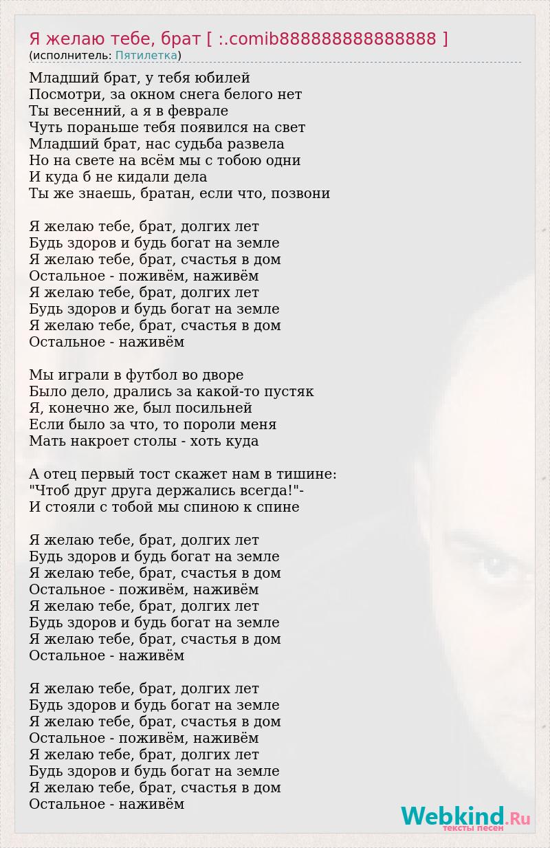 Младший брат, у тебя юбилей Посмотри, за окном снега белого нет Ты весенний, а я в феврале Чуть пораньше тебя появился на свет Младший брат, нас судьба развела Но на свете на всём мы с тобою одни И куда б не кидали дела Ты же знаешь, братан, если что, позвони Я желаю тебе, брат, долгих лет Будь здоров и будь богат на земле Я желаю тебе, брат, счастья в дом Остальное - поживём, наживём Я желаю тебе, брат, долгих лет Будь здоров и будь богат на земле Я желаю тебе, брат, счастья в дом Остальное - наживём Мы играли в футбол во дворе Было дело, дрались за какой-то пустяк Я, конечно же, был посильней Если было за что, то пороли меня Мать накроет столы - хоть куда А отец первый тост скажет нам в тишине: "Чтоб друг друга держались всегда!"- И стояли с тобой мы спиною к спине Я желаю тебе, брат, долгих лет Будь здоров и будь богат на земле Я желаю тебе, брат, счастья в дом Остальное - поживём, наживём Я желаю тебе, брат, долгих лет Будь здоров и будь богат на земле Я желаю тебе, брат, счастья в дом Остальное - наживём Я желаю тебе, брат, долгих лет Будь здоров и будь богат на земле Я желаю тебе, брат, счастья в дом Остальное - поживём, наживём Я желаю тебе, брат, долгих лет Будь здоров и будь богат на земле Я желаю тебе, брат, счастья в дом Остальное - наживём